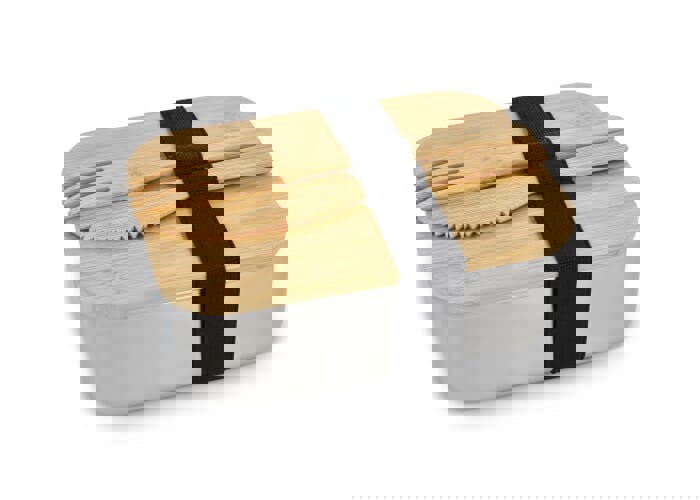Stainless steel lunchbox with bamboo lid. Closed by an elastic strap which also holds the bamboo fork and knife. Individually packed in giftbox.