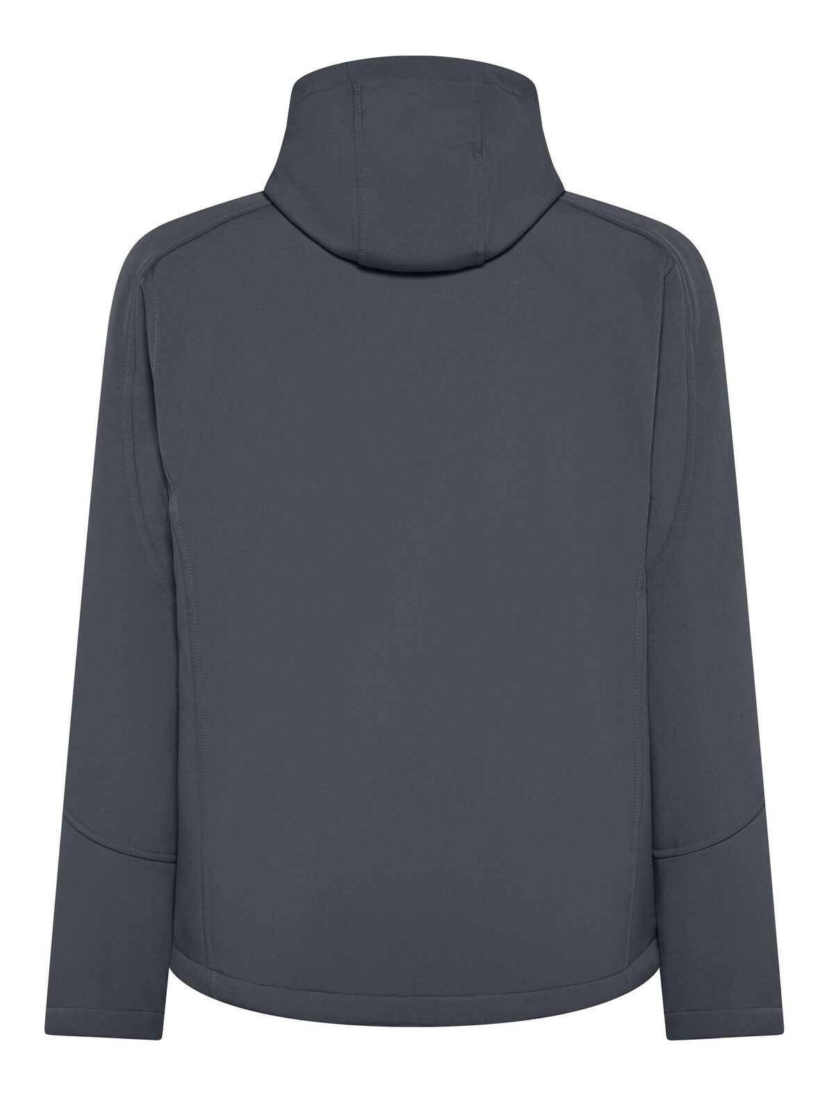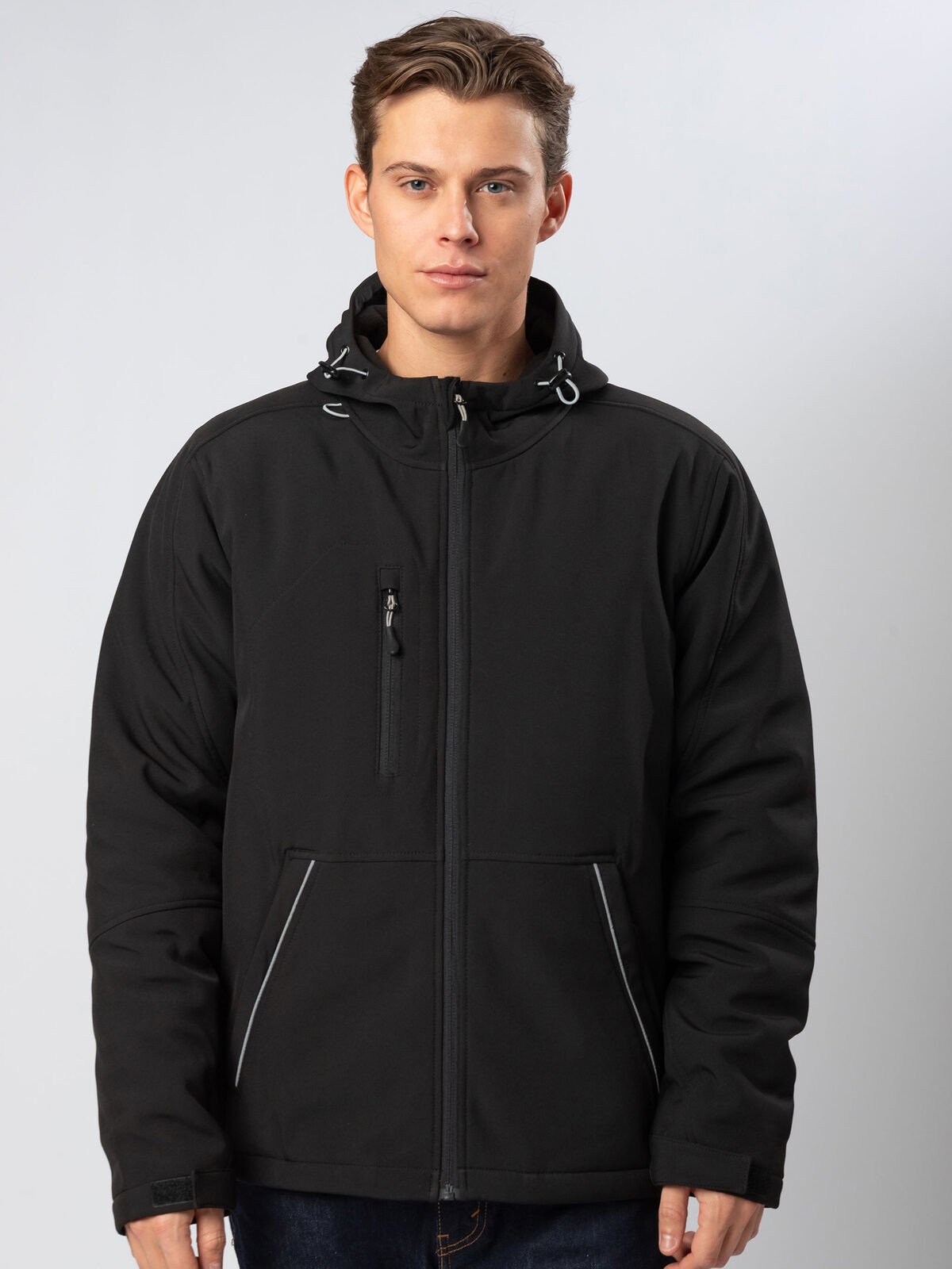 Outer fabric: 94% recycled polyester, 6% elastane Inner layer: 100% polyester. Padding: 100% polyester . 3-layer softshell jacket, padded with adjustable drawstring hood. Eco-sustainable recycled polyester fabric, windproof, rainproof (waterproof rating 8000 w/p), with breathability 1000 mvp. Adjustable Velcro cuffs, convenient front pockets with zippers and reflective piping, chest pocket with zipper. Convenient zipper at the bottom of the garment for easy customization. Woven size label on the collar, logo and washing instructions on the tear-off side label.