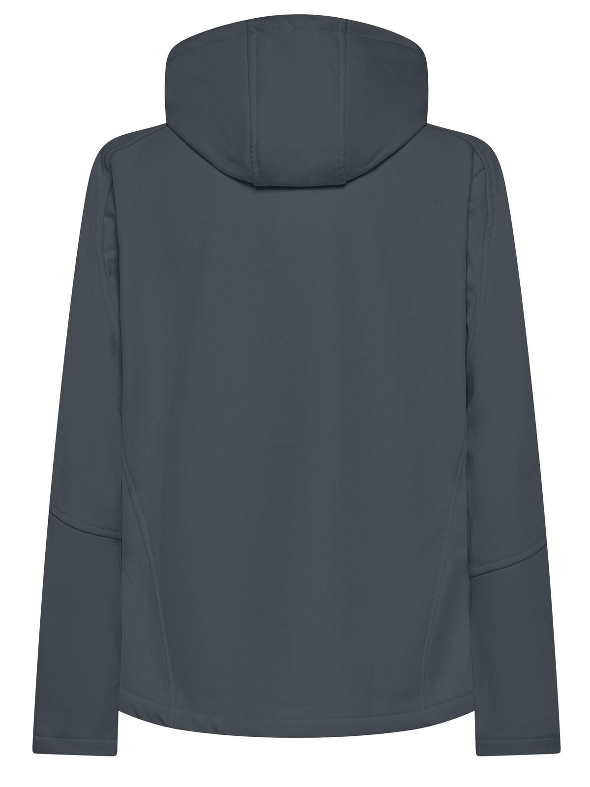 94% polyester, 6% elastane. Women's 3-layer softshell jacket with adjustable hood and waistband using a drawstring. Features practical side pockets and a chest pocket with zip. Also includes an internal zip on the heart side for easy customization. Plastic zipper pulls, adjustable Velcro cuffs, and soft micropile lining. Contrast details such as zips, zipper pulls, and drawstrings in black. Waterproof rating: 8000 mm, breathability: 1000 g/m². Tear-Away label.