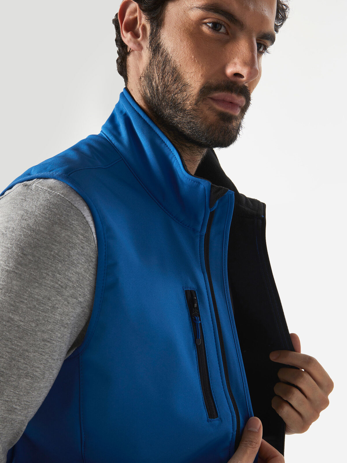 96% polyester, 4% elastane. 2-layer softshell vest with front zip, chest pocket with zip and side zip pockets in contrasting colour. Interior in soft microfleece. Tear-Away label.