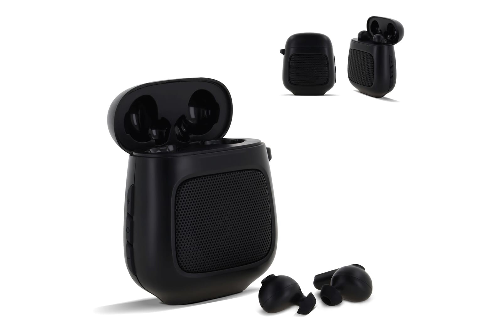 TruWireless earbuds and speaker in one. Suitable to play music to a group of people through the speaker, or just to yourself through the earbuds. Both features easily connect wirelessly.
