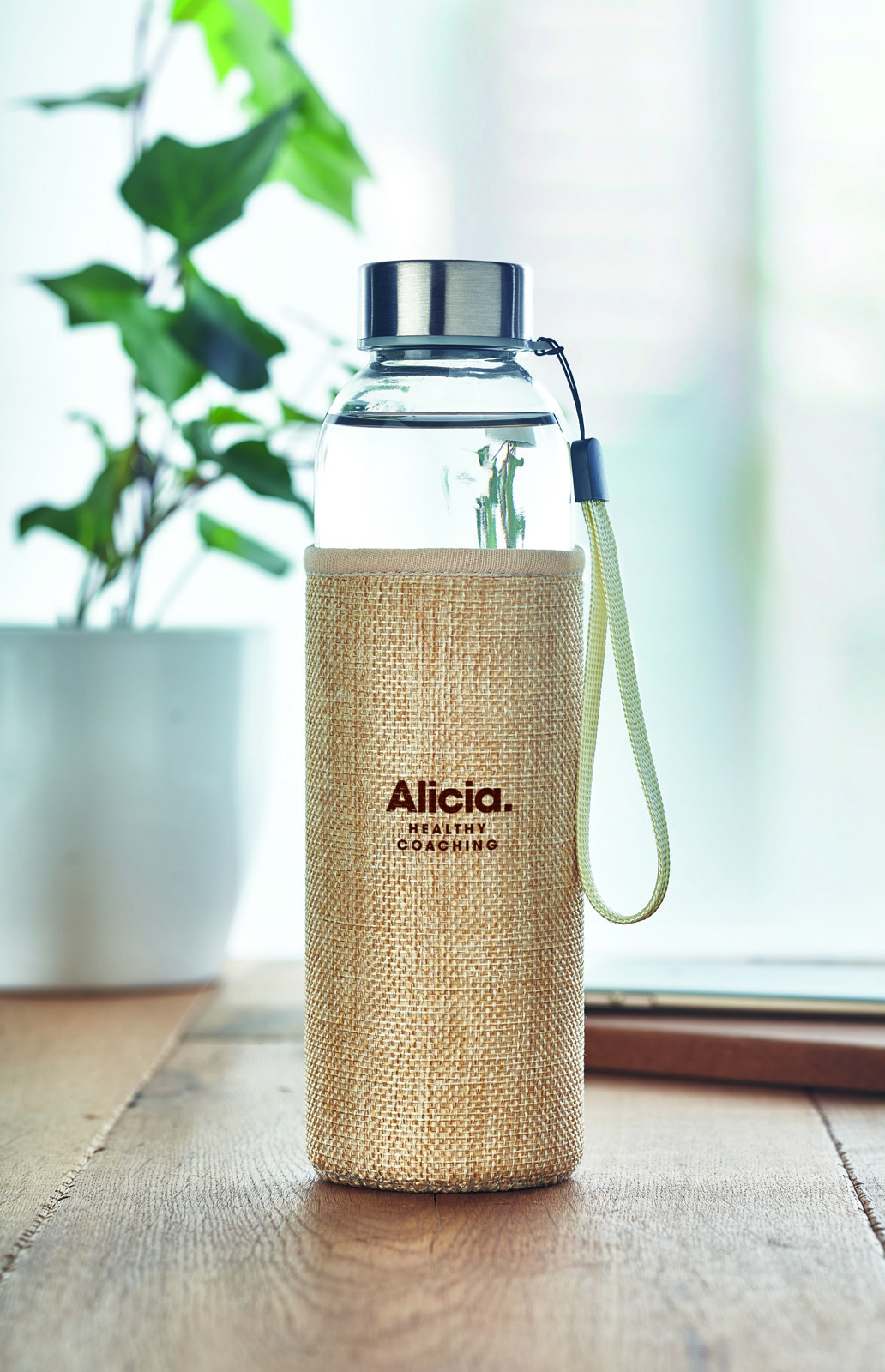 Crafted for everyday practicality with a touch of eco-conscious style, the Glass Bottle in Pouch 500ml Utah Touch is the ideal gift for corporate partners, clients, or employees. This premium 500 ml soda lime glass bottle is protected by a stylish pouch made from a blend of neoprene-style and jute materials — offering both functionality and a refined appearance for professionals on the go.