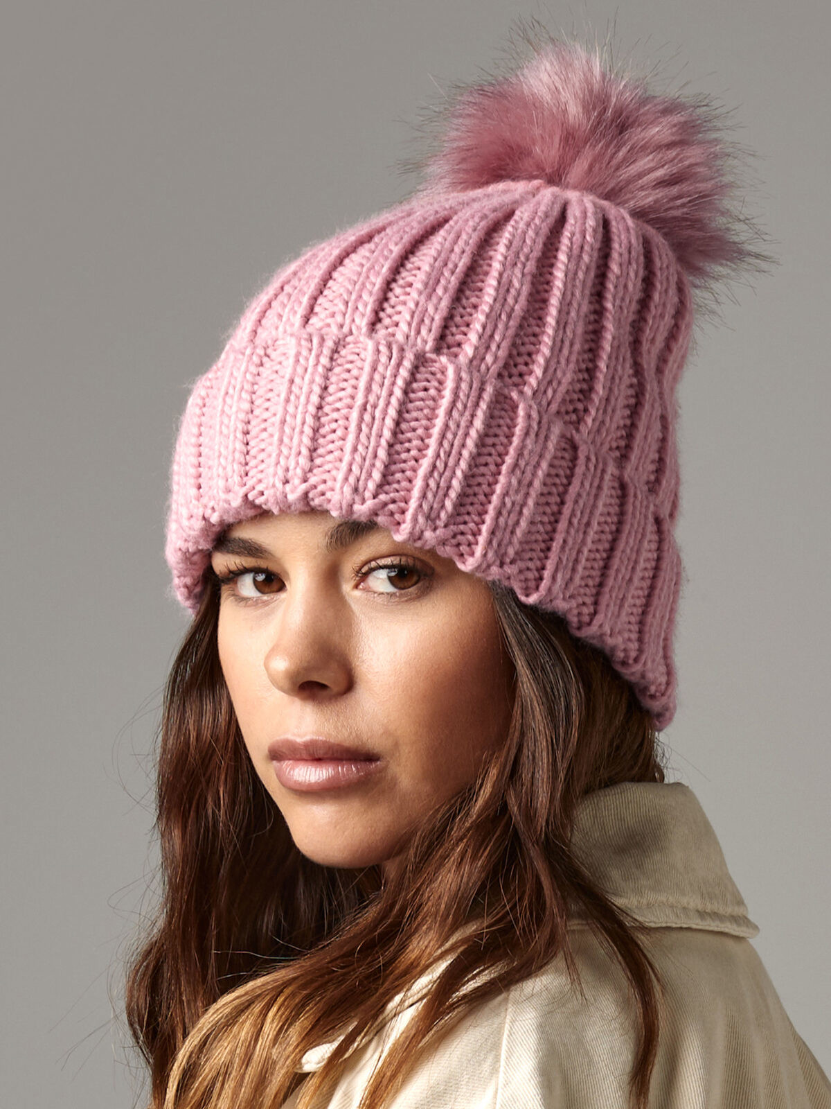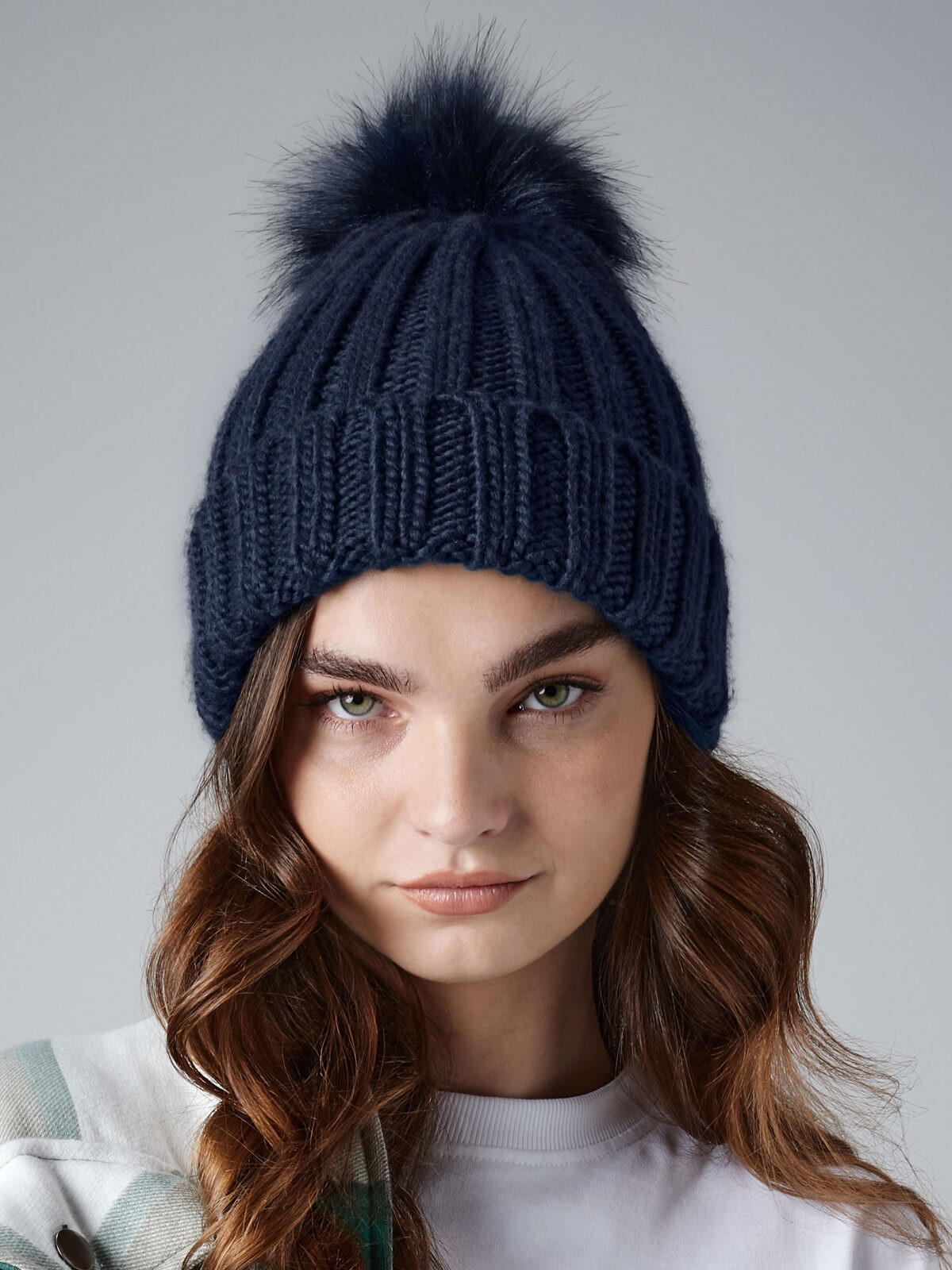 100% Soft-Spun Acrylic. TearAway label for ease of rebranding, Luxury self-coloured faux fur pom pom, Removable pom pom for ease of washing, Unisex styling, Cuffed design for optimal decoration. Sumptuous heavy ribbed knit