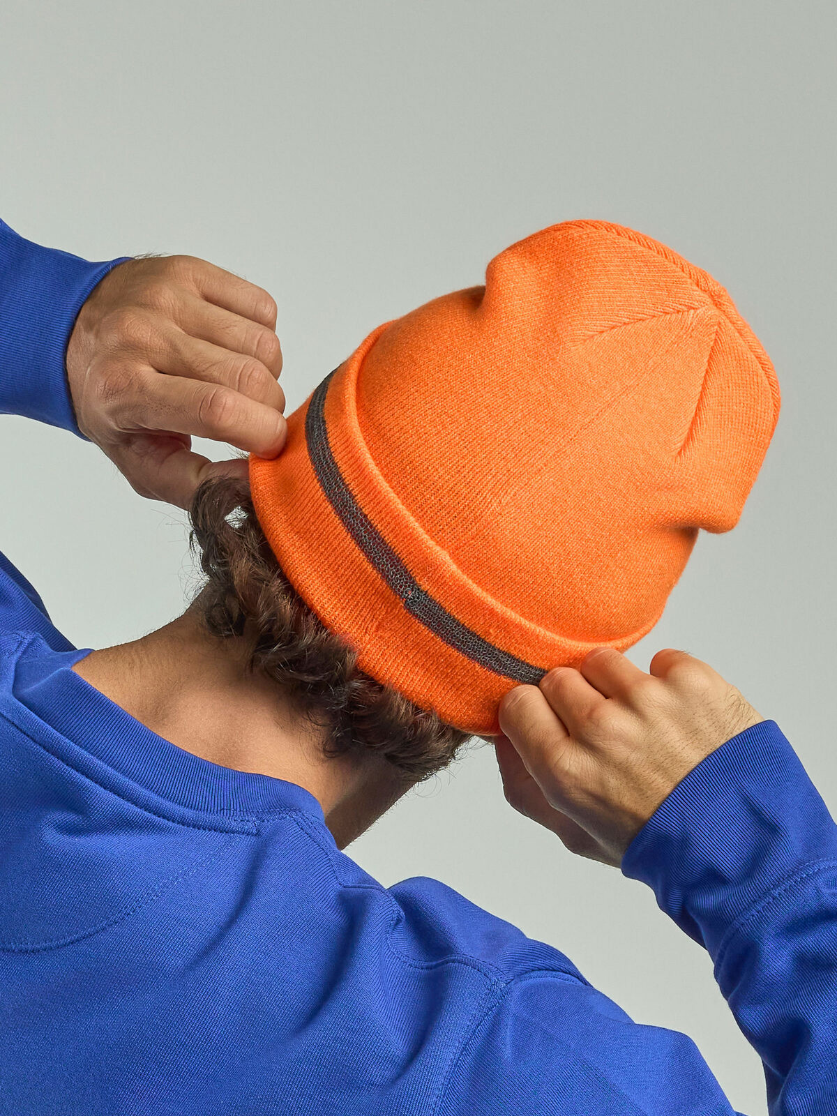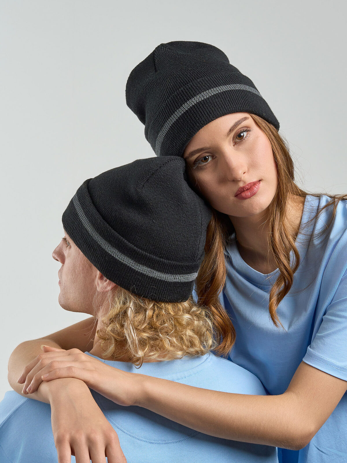 100% recycled polyester yarn with reflective metal thread band. Beanie, recycled polyester, reflective band, high visibility. Beanie with cuff made of recycled polyester yarn. Soft hand feel, double layer of fabric and flat machine finish. Reflective band on cuff for high visibility. Weight: 74g. Ex code: ATWROT
