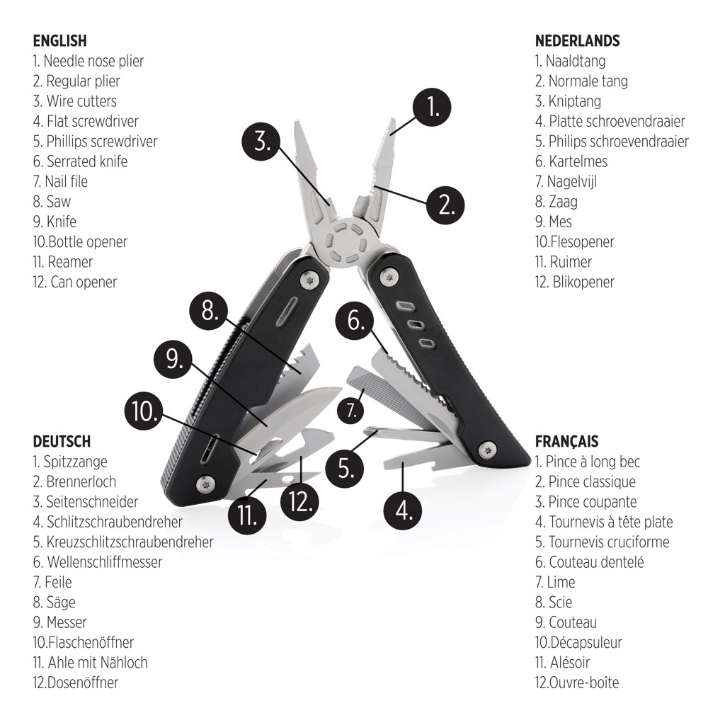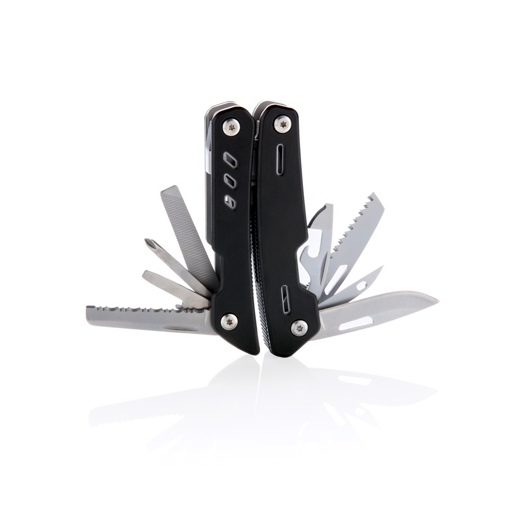 Crafted from durable stainless steel and aluminium, it balances strength with a sleek, lightweight form. Measuring 100mm in length and weighing just 238.8g, it is compact enough to carry comfortably yet robust enough to handle demanding tasks. The multitool is elegantly packaged in a 600D pouch and comes in a plain individual box—ready to impress clients, partners, or employees.