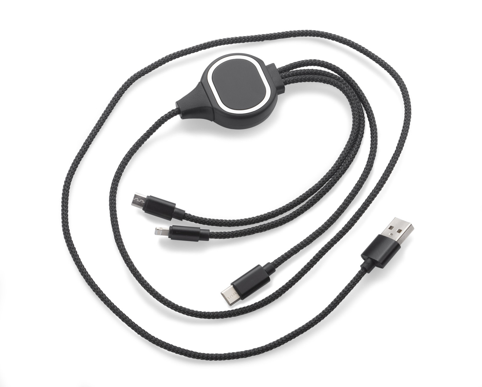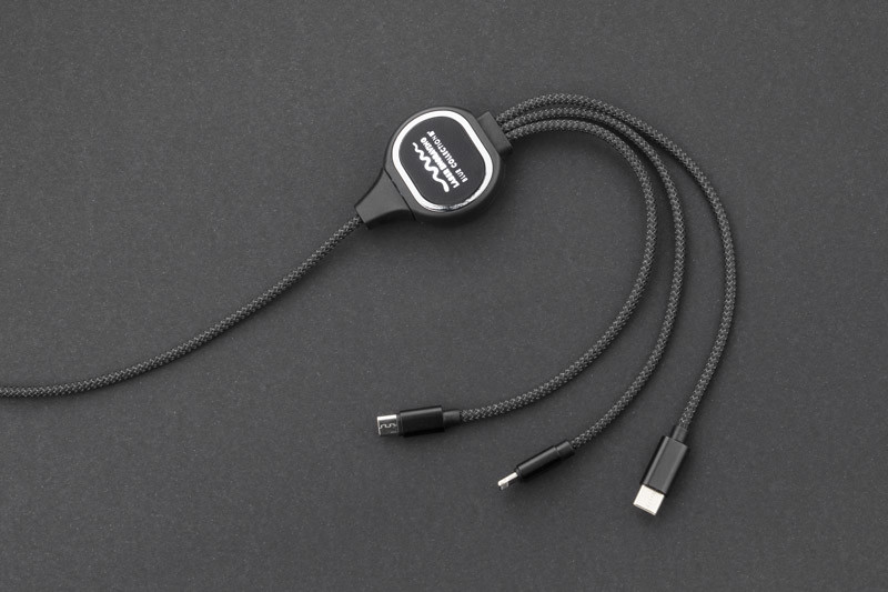 The LUX cable is a great advertising gadget because it has the perfect place for an engraved logo that will illuminate when the cable is connected! It is a 3 in 1 cable, containing plugs in micro USB, USB type C and Lightining (iPhone) standard. The cable itself is coated with reinforced material and is about 1 m long. The cable is for charging only.