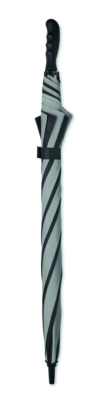 69 cm samodejno odprt dežnik v 190T pongeeju s črno prevlečeno kovinsko gredjo in rebri. Črni plastični nasveti. Raven črn EVA ročaj. Ročno zapiranje.