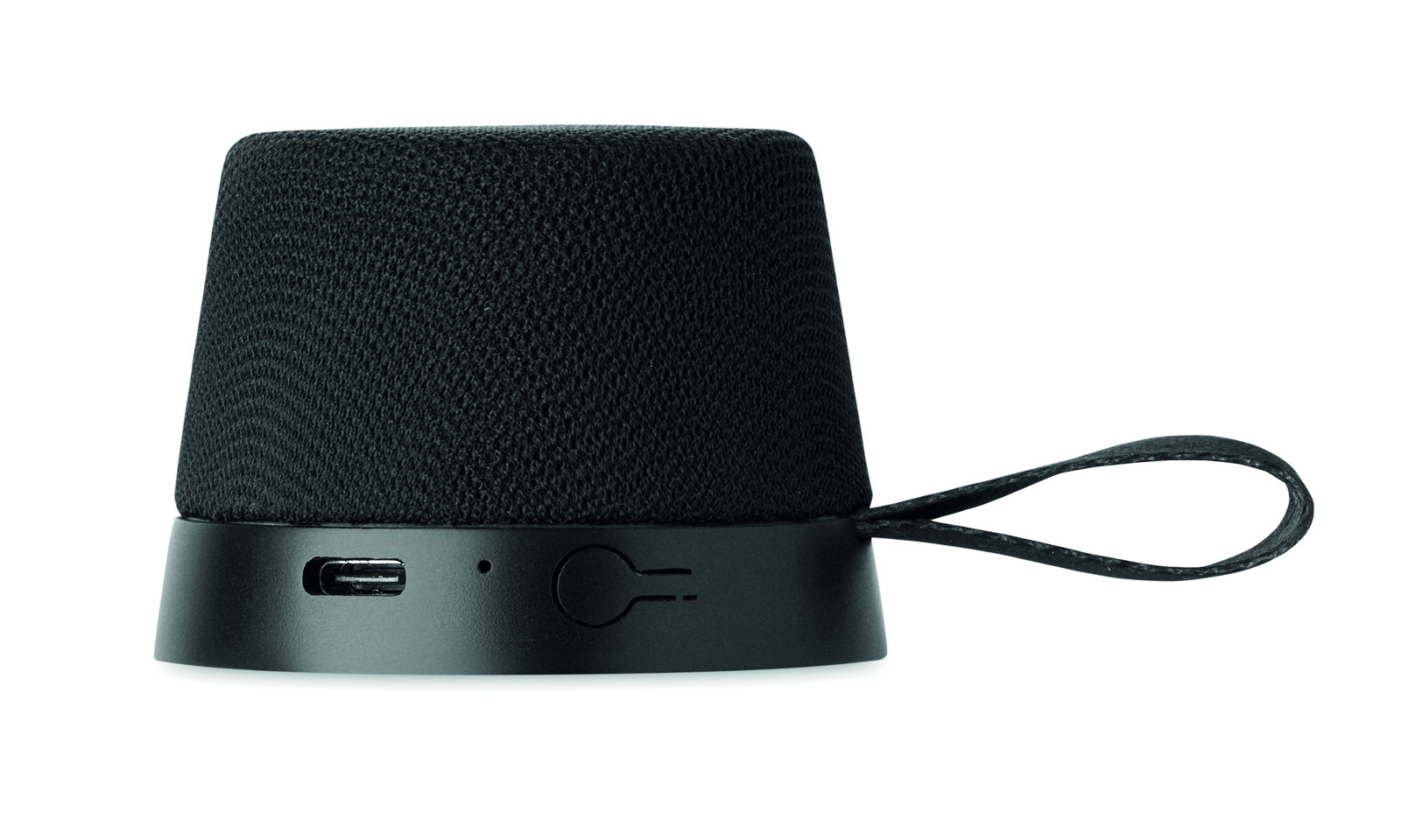 4.2 wireless speaker in ABS casing, RPET polyester fabric and loop. Magnet on back part supports stand functionality. Rechargeable Li-ION 300 mAh battery included. Output data: 3W, 4 Ohm and 5V. Playing time approx. 2hours.