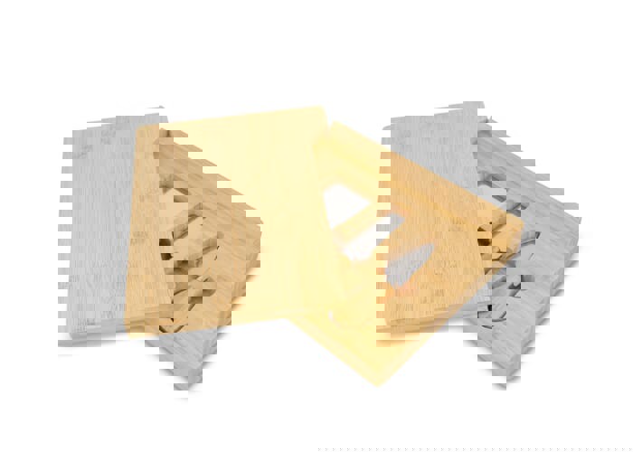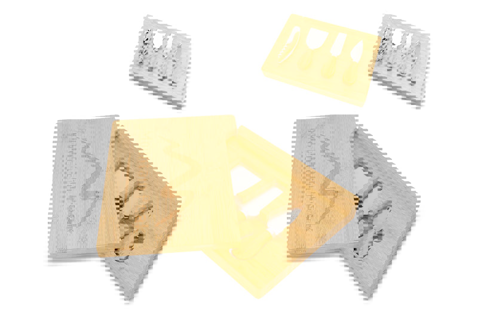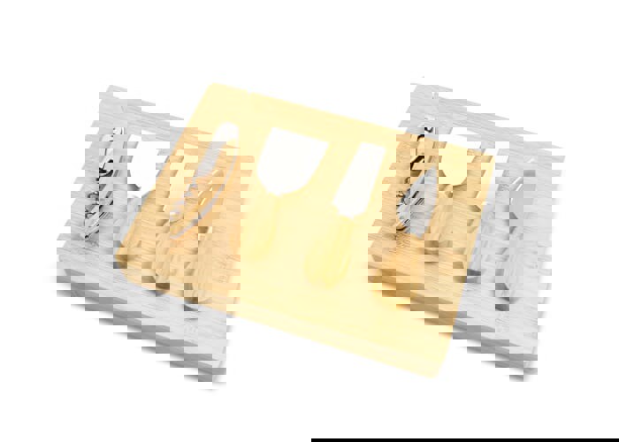 This set includes three cheese knives and a wine bottle opener, stored in a bamboo box that doubles as a serving board. The knives are designed for different cheese varieties, while the box adds convenience and style.