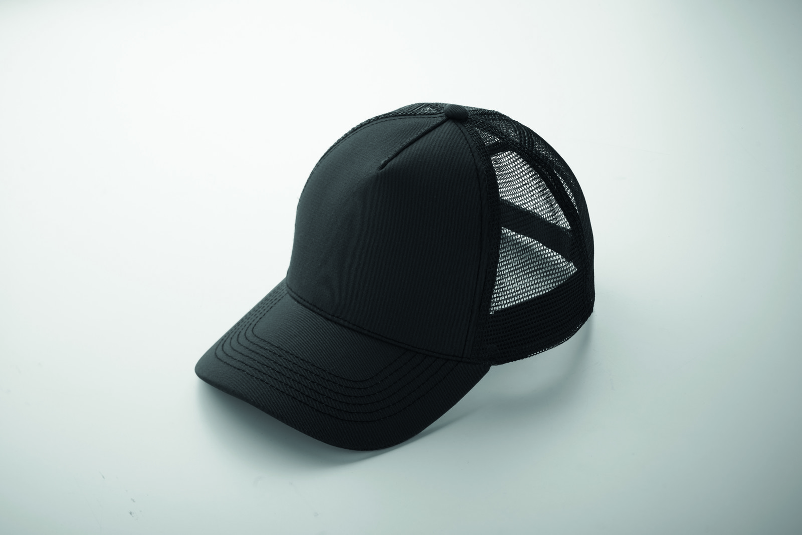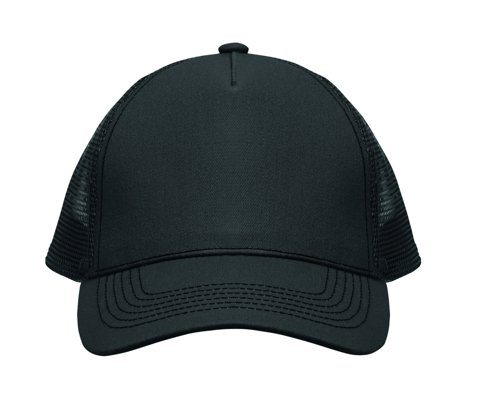 5 panel trucker cap with front panel and visor in 250 gr/m² cotton, back mesh in polyester, hook and loop closure.