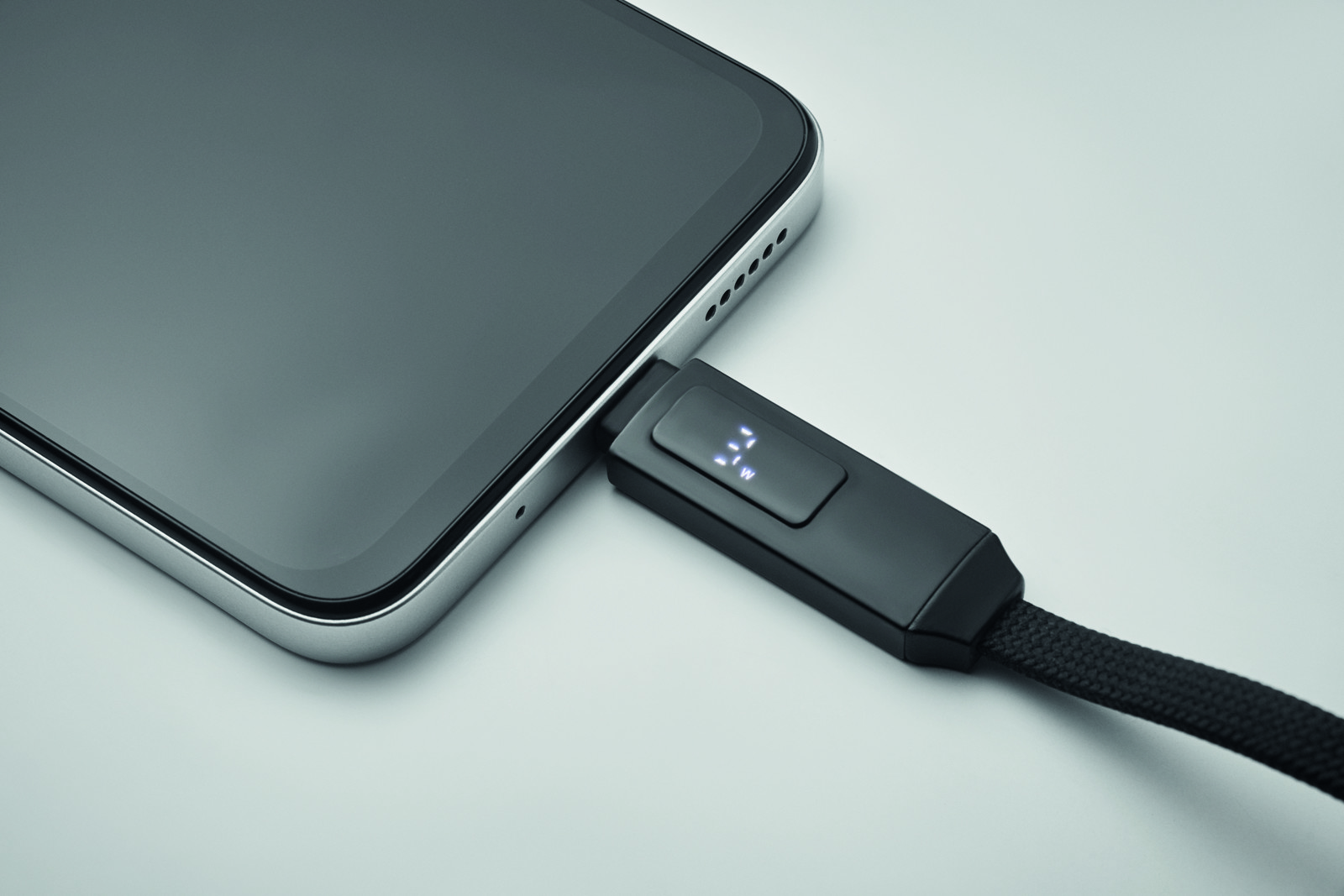 60W charging and data cable with keyring. Type-C to type-C with LED screen with charging power display feature. Magnet closure.