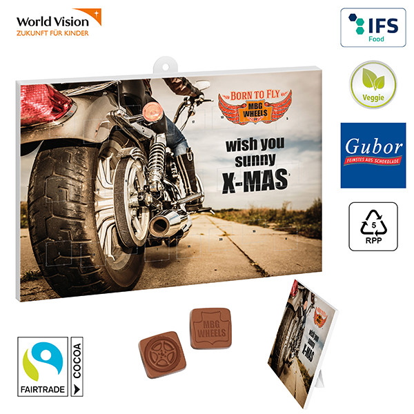 Wall and Table Advent Calendar on option in vertical or horizontal format, stable deep-drawn sections, filled with milk chocolate, minimum 30 % cocoa, 3 x glued, 24 doors.