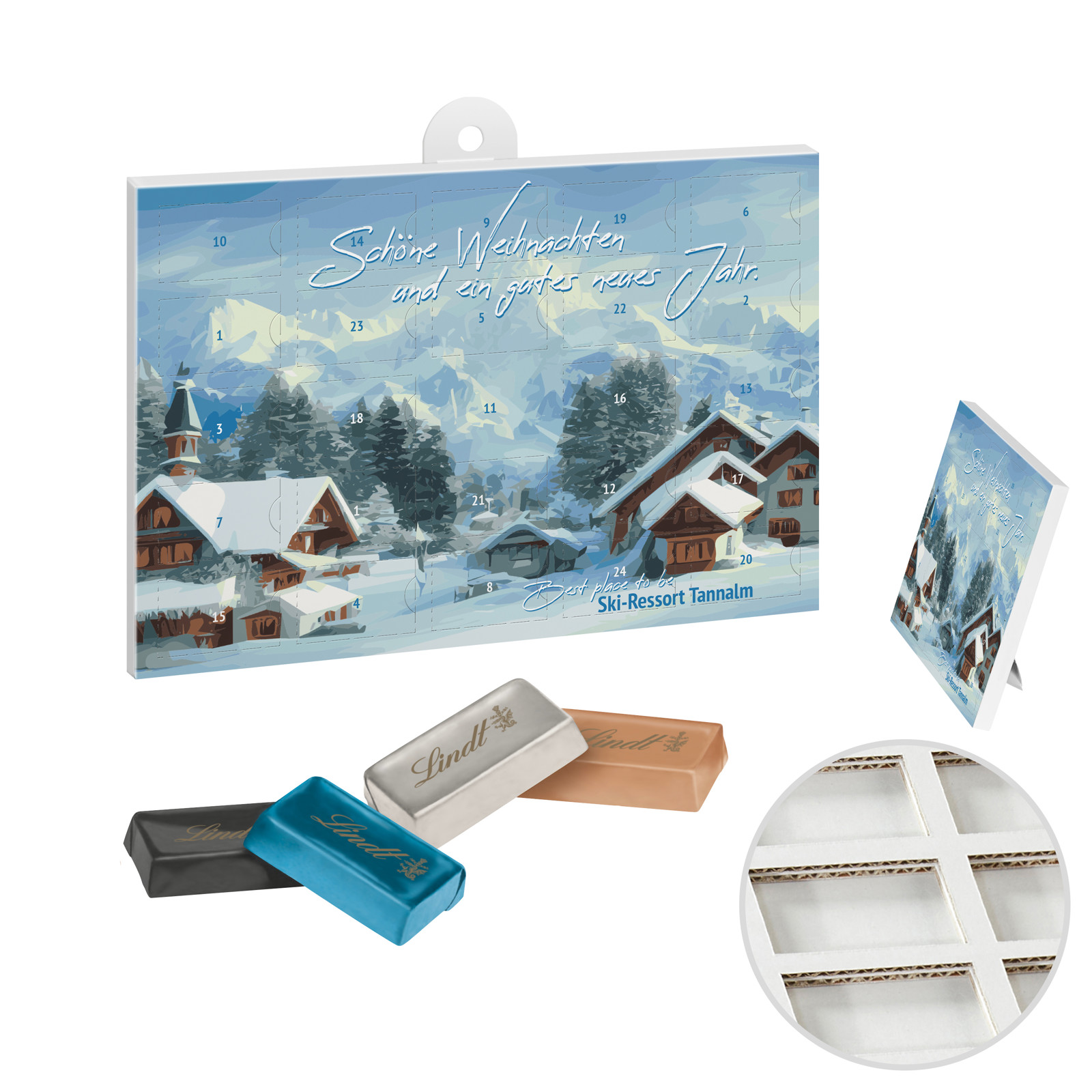 Table and wall Advent calendar in horizontal format, with stable inlay, made of 100 % recyclable paper, 24 doors, filled with Lindt Naps in 4 colours, randomly mixed. Milk chocolate, cocoa: 30 % minimum.
