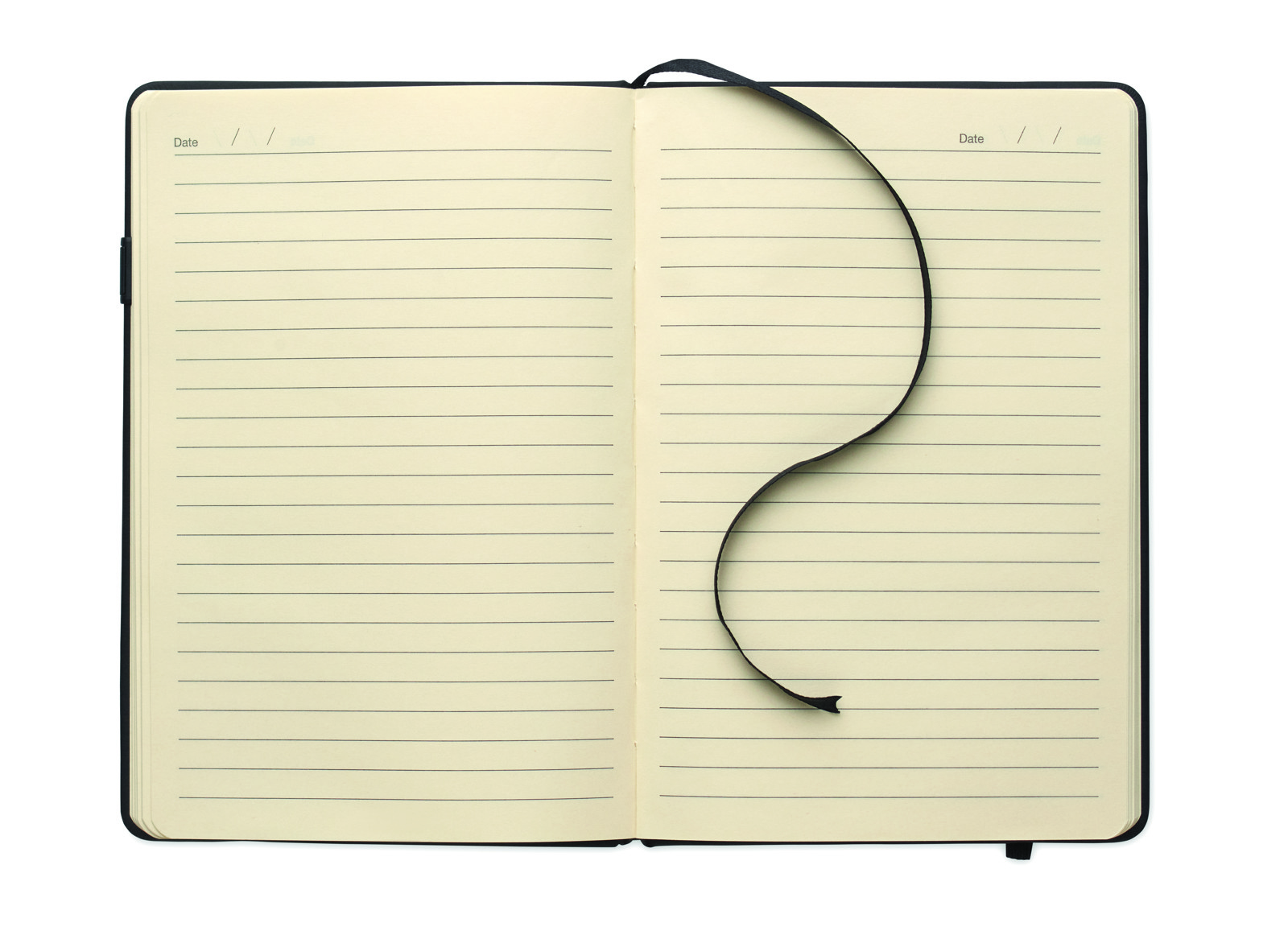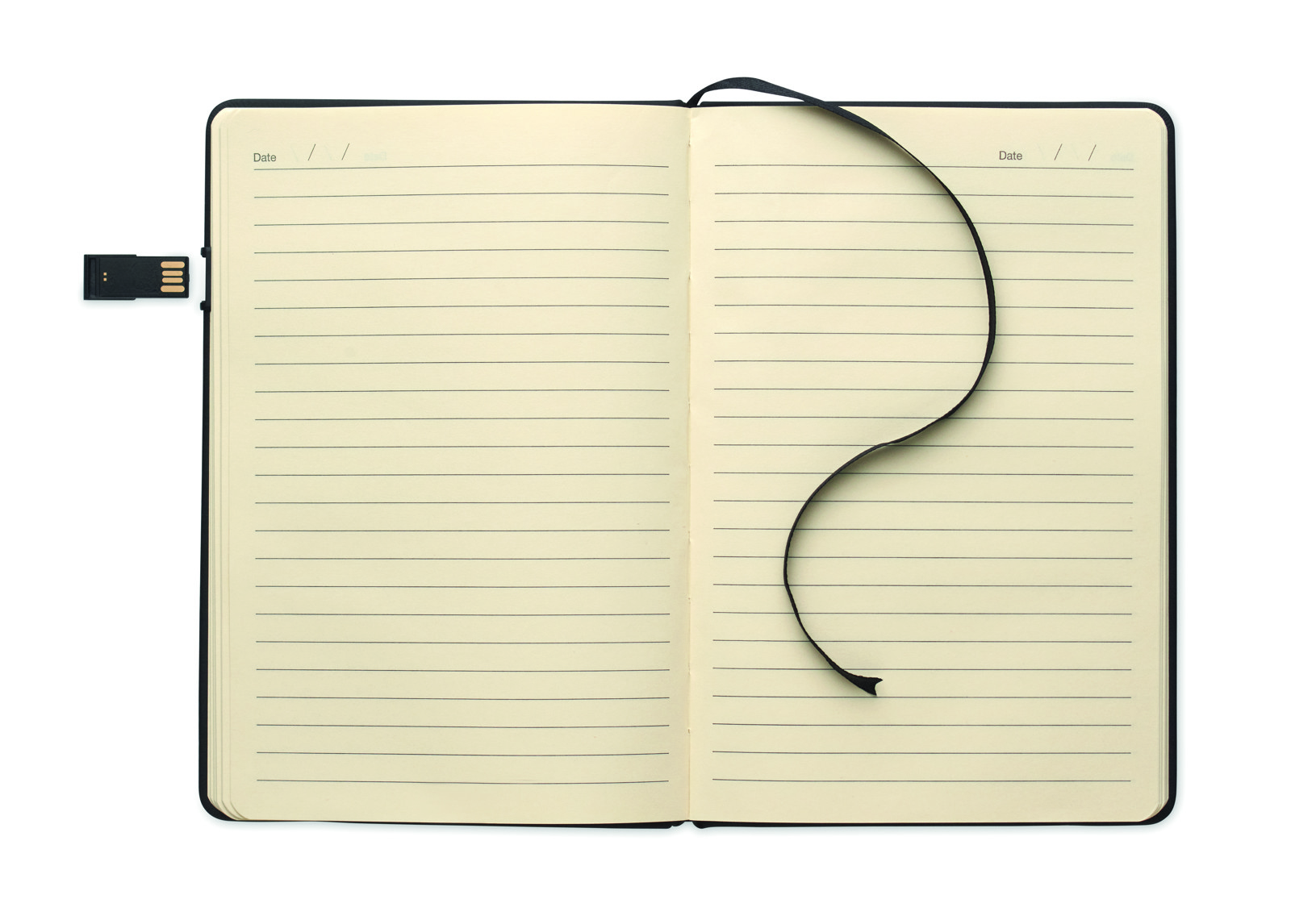 A5 notebook in hard cover made of 58% recycled polyester and 42% PU including integrated 16GB USB stick. Casebound. 160 lined recycled paper pages (80 sheets). Matching elastic closure strap and ribbon page-marker. FSC®-certified | FSC MIX CREDIT, P7.1, FSC-C213206