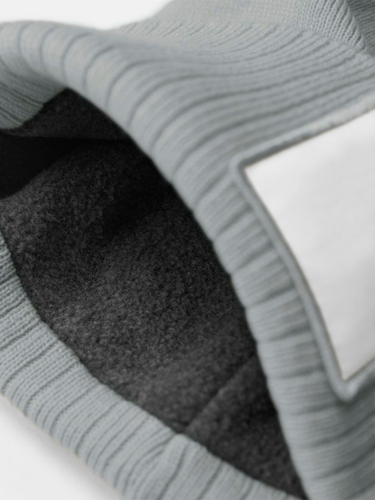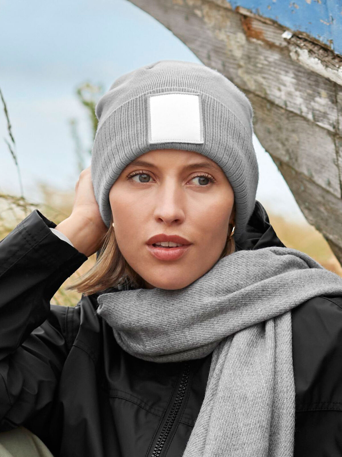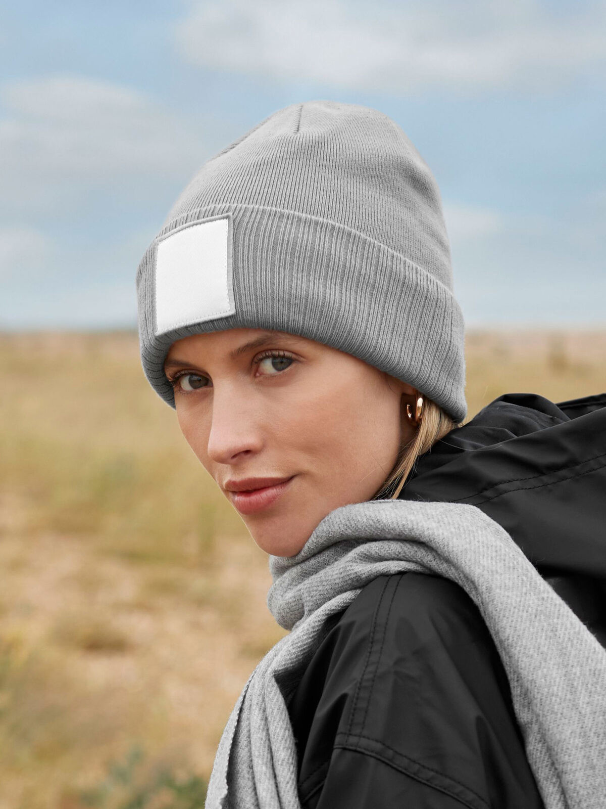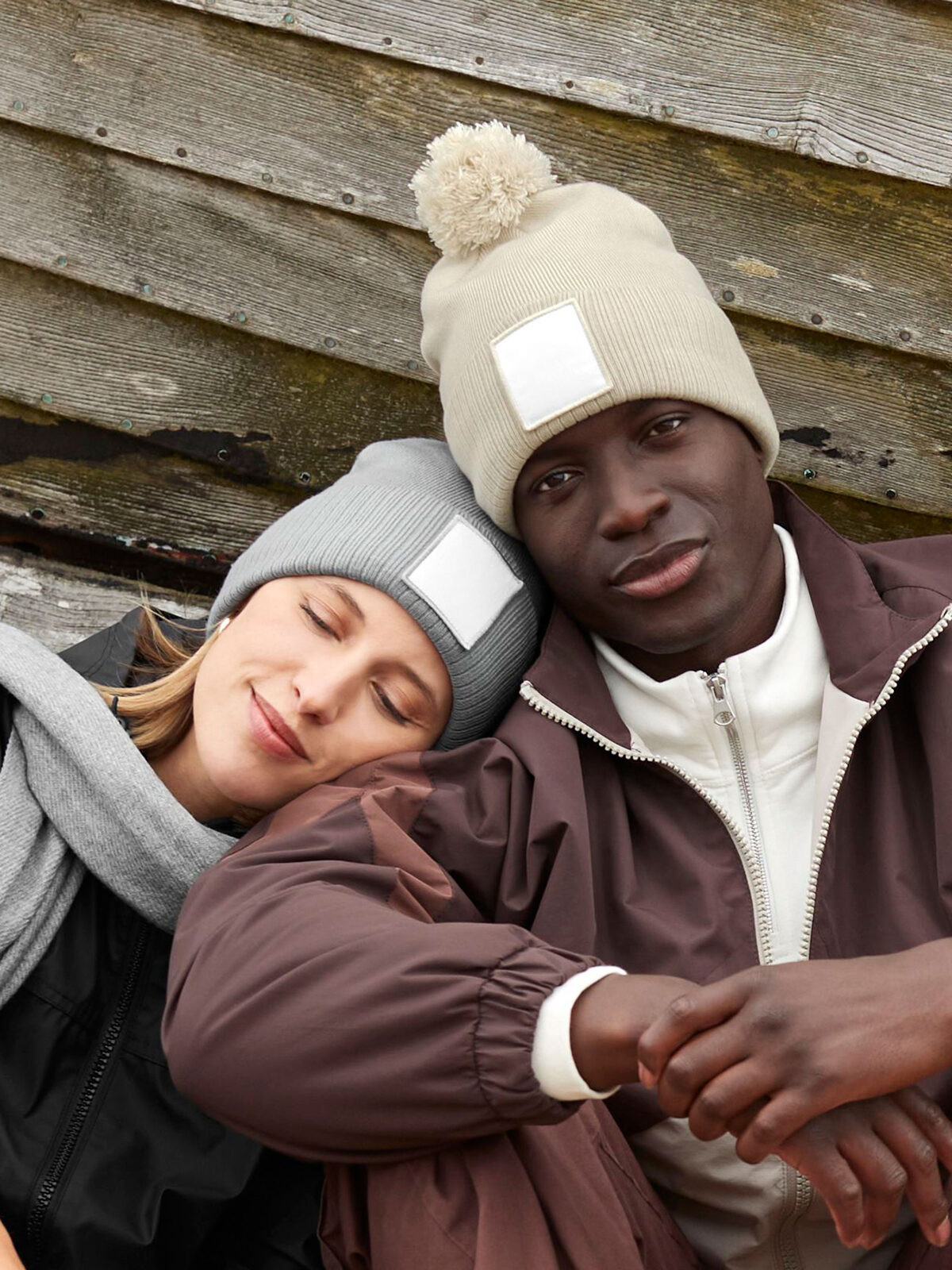 100% recycled polyester. Double layer knit beanie, cotton twill patch for decoration, microfleece lining for confort and warmth. TearAway label for ease of rebranding.