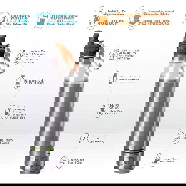 S pametnim zapiranjem na gumb in integrirano skodelico se funkcionalnost sreča s priročnostjo v tem kompaktnem spremljevalcu. Izdelan iz vzdržljivega nerjavečega jekla in polipropilena, zagotavlja odlično dolgo življenjsko dobo in zmogljivost. Zaradi svojih dimenzij – 245 mm v višino in 68 mm v premeru – je idealna velikost za potovanja ali pisarniško uporabo.