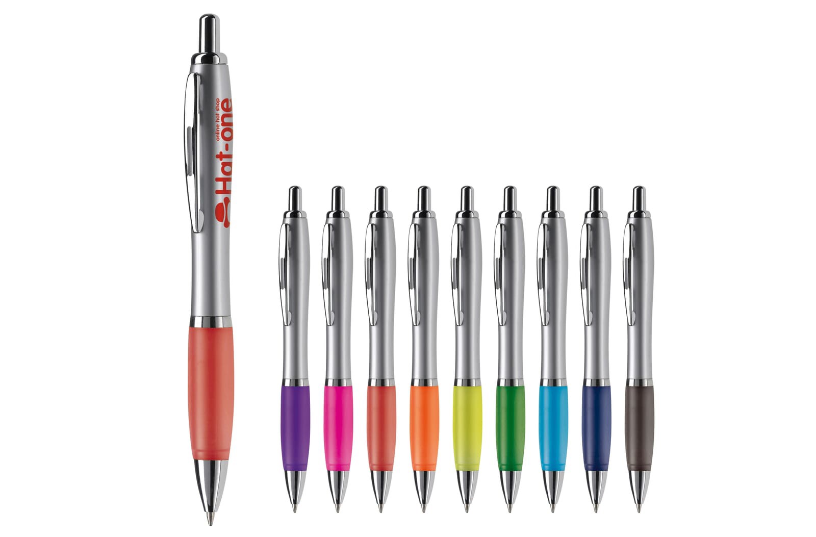 Silver ball pen with metal clip and a coloured grip. The pen comes with a Jumbo refill with blue writing ink.