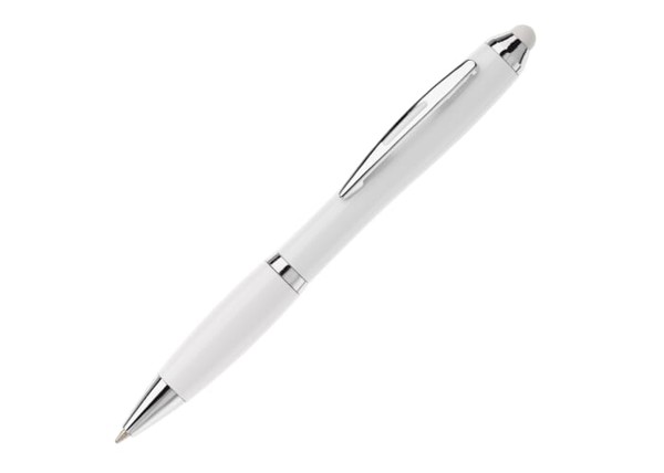 Ball pen with a touchscreen tip, twist mechanism, metal look tip, ring and clip. Blue writing ink X20 refill.