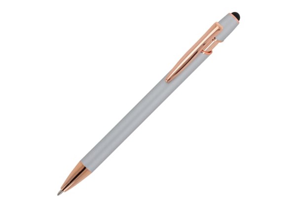 Rose Gold aluminum ball pen with elegant soft-touch finish and stylus. With a solid metal clip. Writing colour: blue.