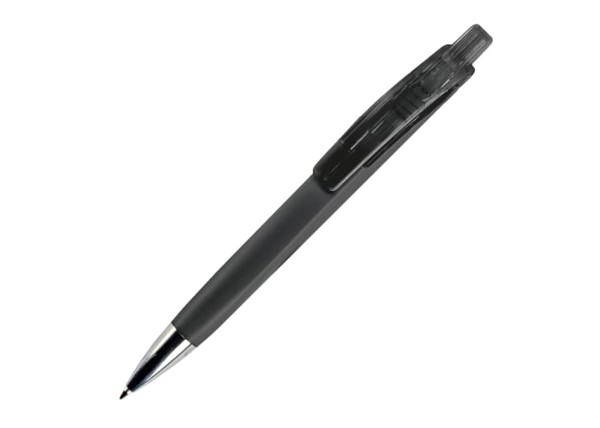 Toppoint design ball pen. This pen has a Jumbo refill and a metal tip. It has a soft-touch finish and a transparent clip. With a blue writing ink refill.