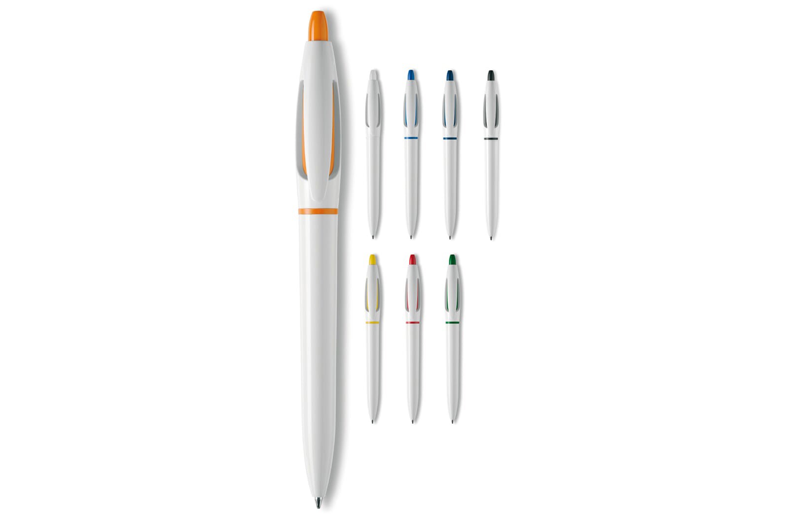 Hardcolour ball pen S! with white barrel and clip. The pusher and ring are coloured. Including a X20 refill with blue writing ink. The pen has a pusher mechanism and is made of ABS, made in Europe. From 5.000 pieces other writing colours possible. Standard refill color: Blue