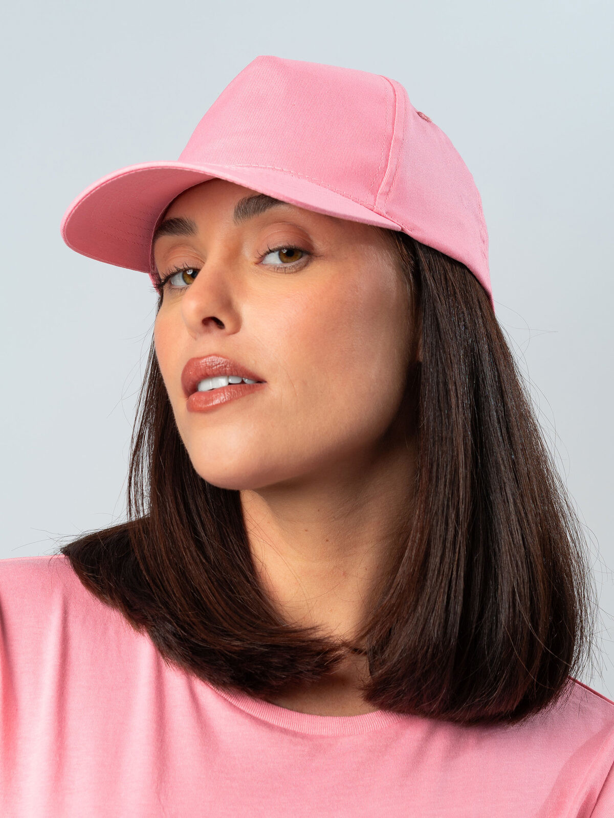 100% cotton. 5 panels cap with velcro closure, polyester sweatband, stitched eyelets, structured front panel, precurved visor. Fluorescent colours 100% polyester. Tear-off label.