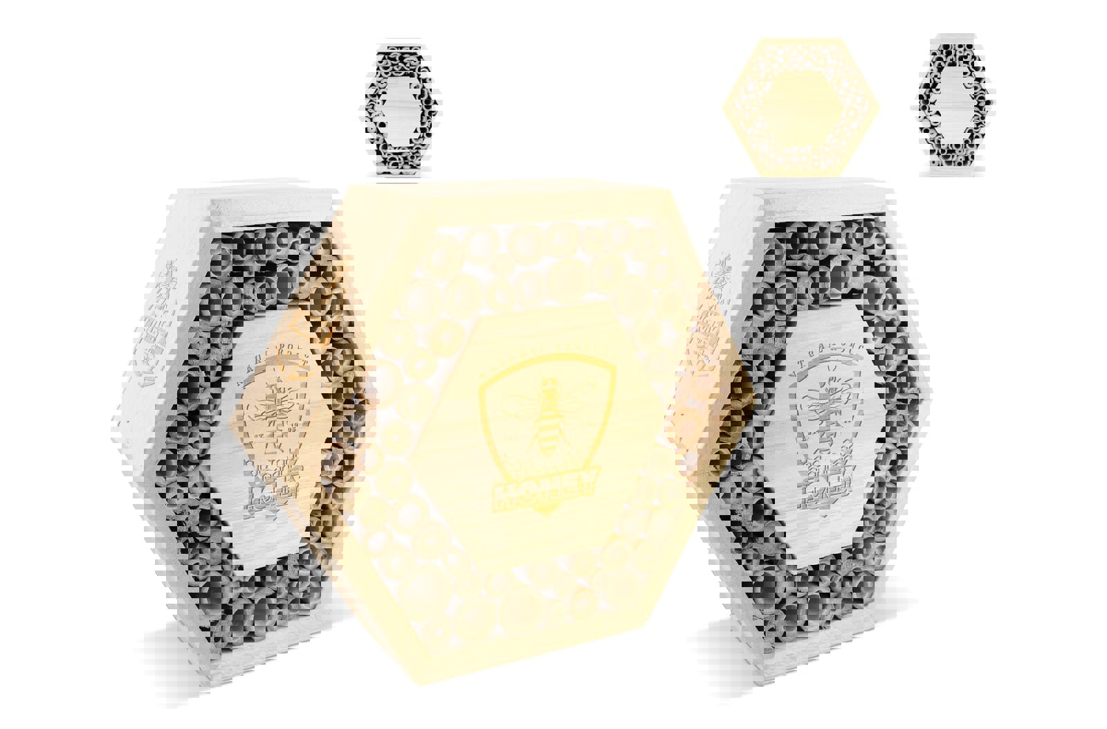 Hexagon bee house made of FSC wood with large central branding area. Suitable for solitary bees like mason and leafcutter bees. These harmless bees are vital pollinators that support biodiversity in gardens and green spaces. A sustainable and educational promotional gift.