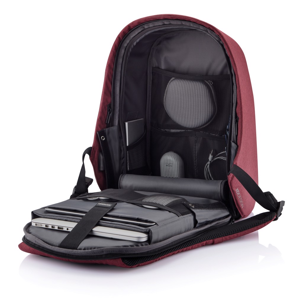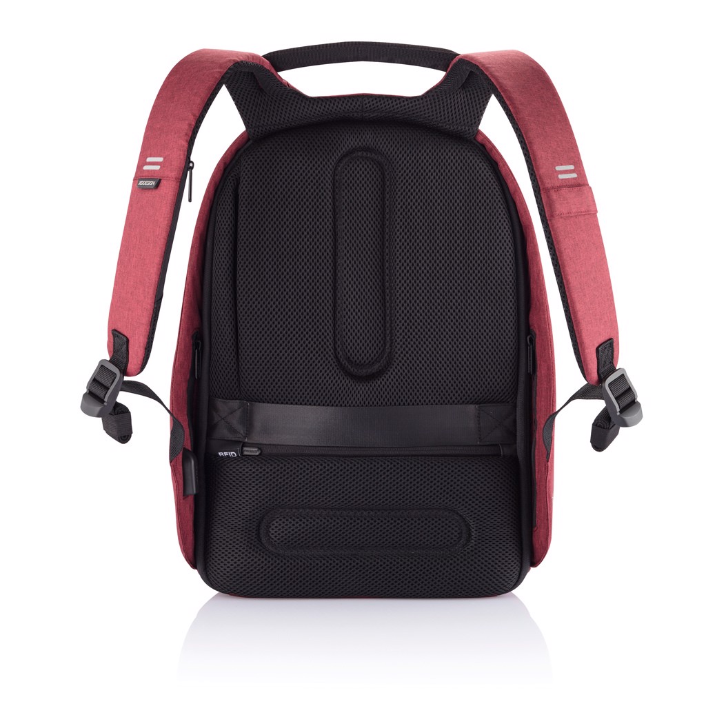 Njena izjemna lastnost je kombinacijska ključavnica, ojačana z jeklom, ki zavaruje glavni predal na zvitku in omogoča tudi zaklepanje torbe na fiksne predmete – kot nalašč za varno potovanje v prometnih okoljih. Skriti žepi, zaščiteni z RFID na zadnji plošči in naramnici varujejo vaše osebne podatke, medtem ko notranji podloženi predelki podpirajo prenosnike do 15,6" in tablične računalnike do 12,9".