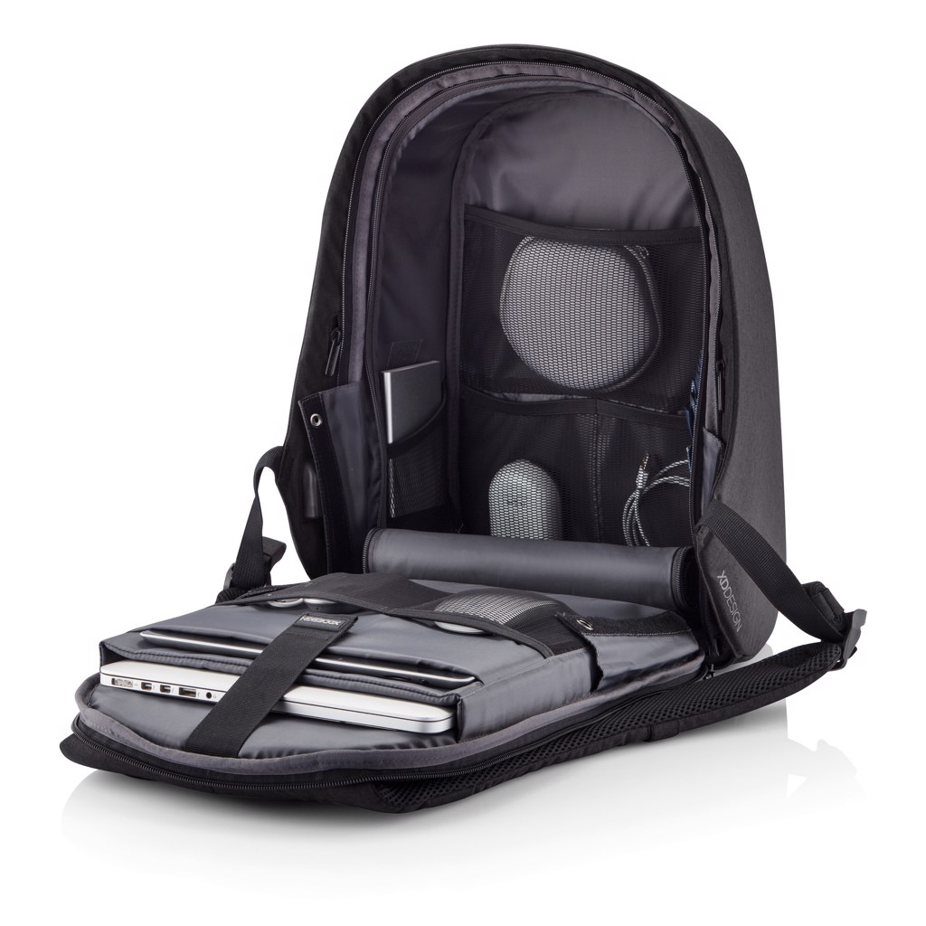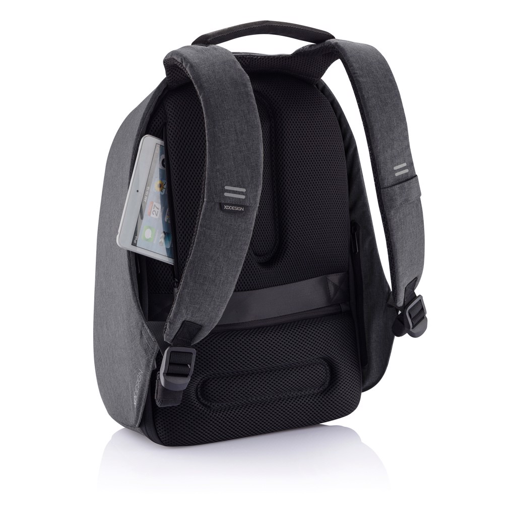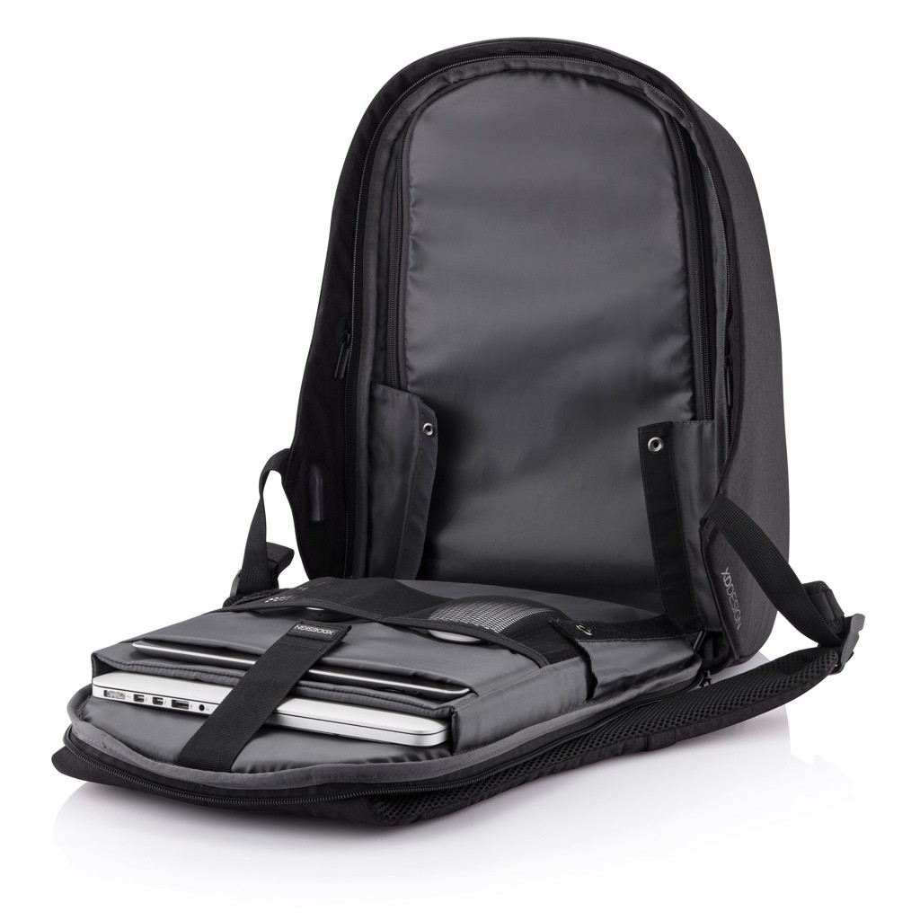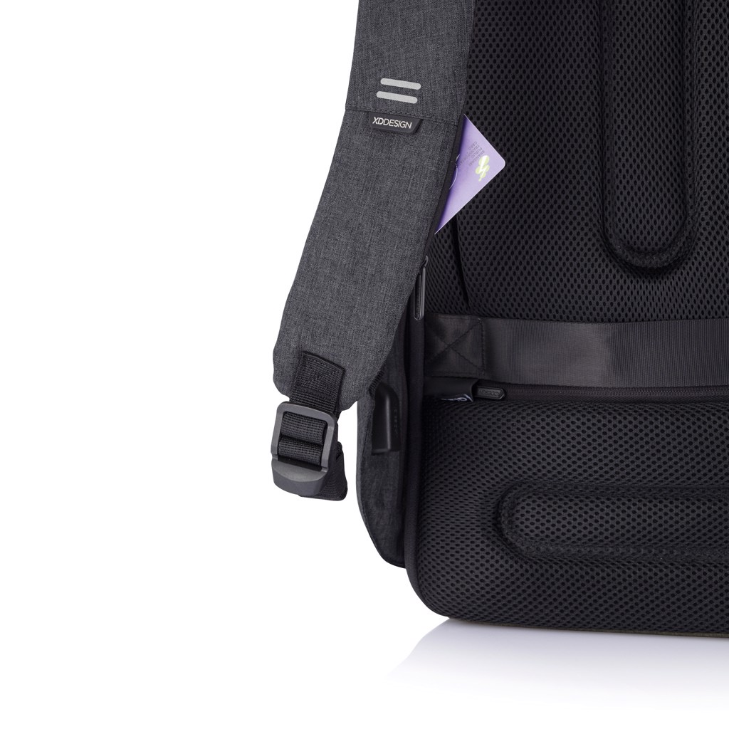 Njena izjemna lastnost je kombinacijska ključavnica, ojačana z jeklom, ki zavaruje glavni predal na zvitku in omogoča tudi zaklepanje torbe na fiksne predmete – kot nalašč za varno potovanje v prometnih okoljih. Skriti žepi, zaščiteni z RFID na zadnji plošči in naramnici varujejo vaše osebne podatke, medtem ko notranji podloženi predelki podpirajo prenosnike do 15,6" in tablične računalnike do 12,9".