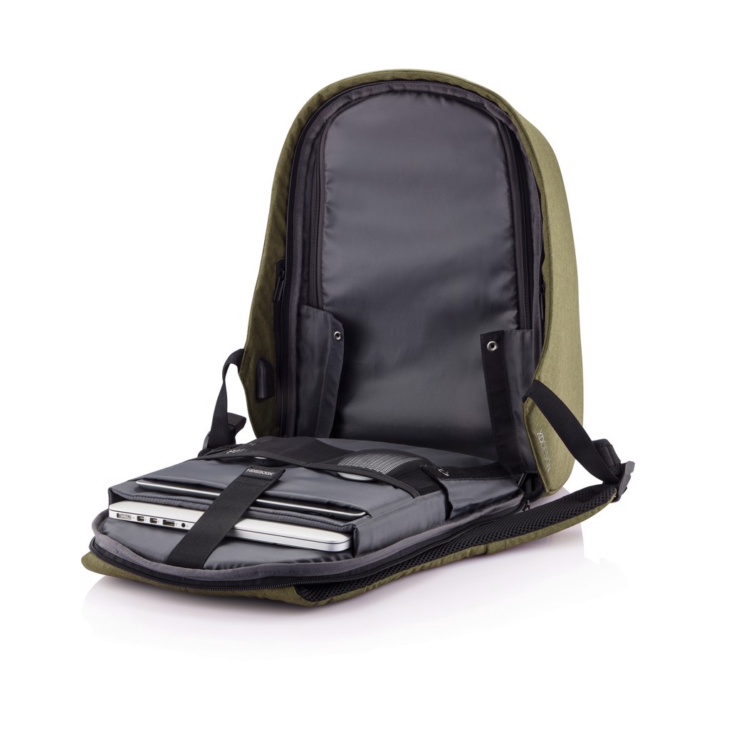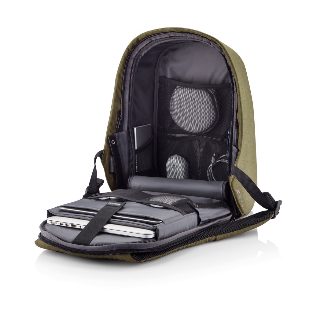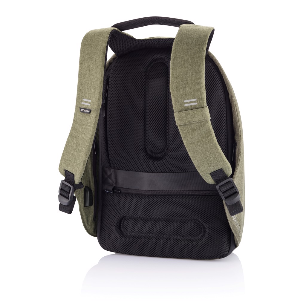 Njena izjemna lastnost je kombinacijska ključavnica, ojačana z jeklom, ki zavaruje glavni predal na zvitku in omogoča tudi zaklepanje torbe na fiksne predmete – kot nalašč za varno potovanje v prometnih okoljih. Skriti žepi, zaščiteni z RFID na zadnji plošči in naramnici varujejo vaše osebne podatke, medtem ko notranji podloženi predelki podpirajo prenosnike do 15,6" in tablične računalnike do 12,9".