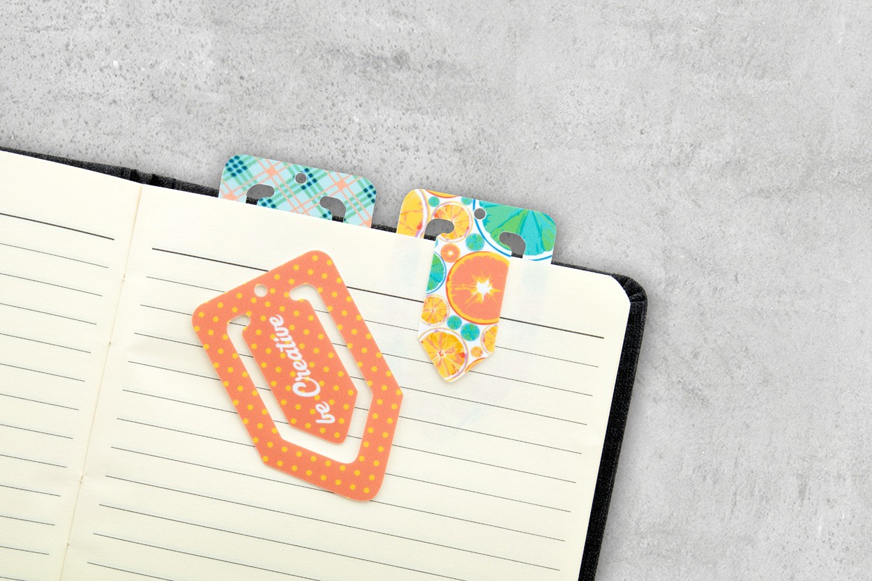 Plastic paper clip bookmark with custom graphics. Price includes UV LED printing on one side. MOQ: 250 pcs.
