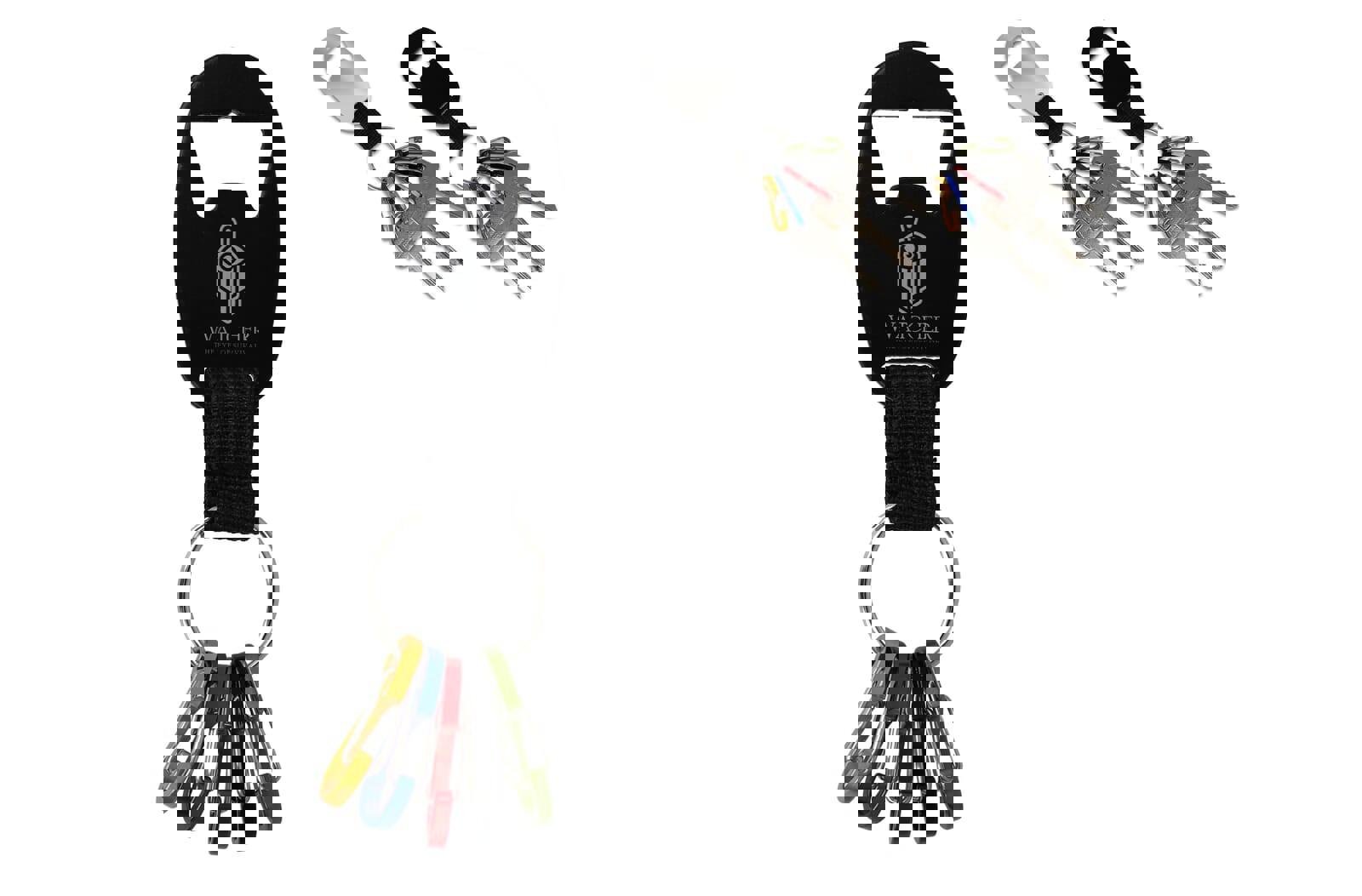 Bottle opener key chain made from recycled aluminum, featuring 5 small carabiner-style hooks to organize your keys. A practical and eco-friendly accessory for everyday use.