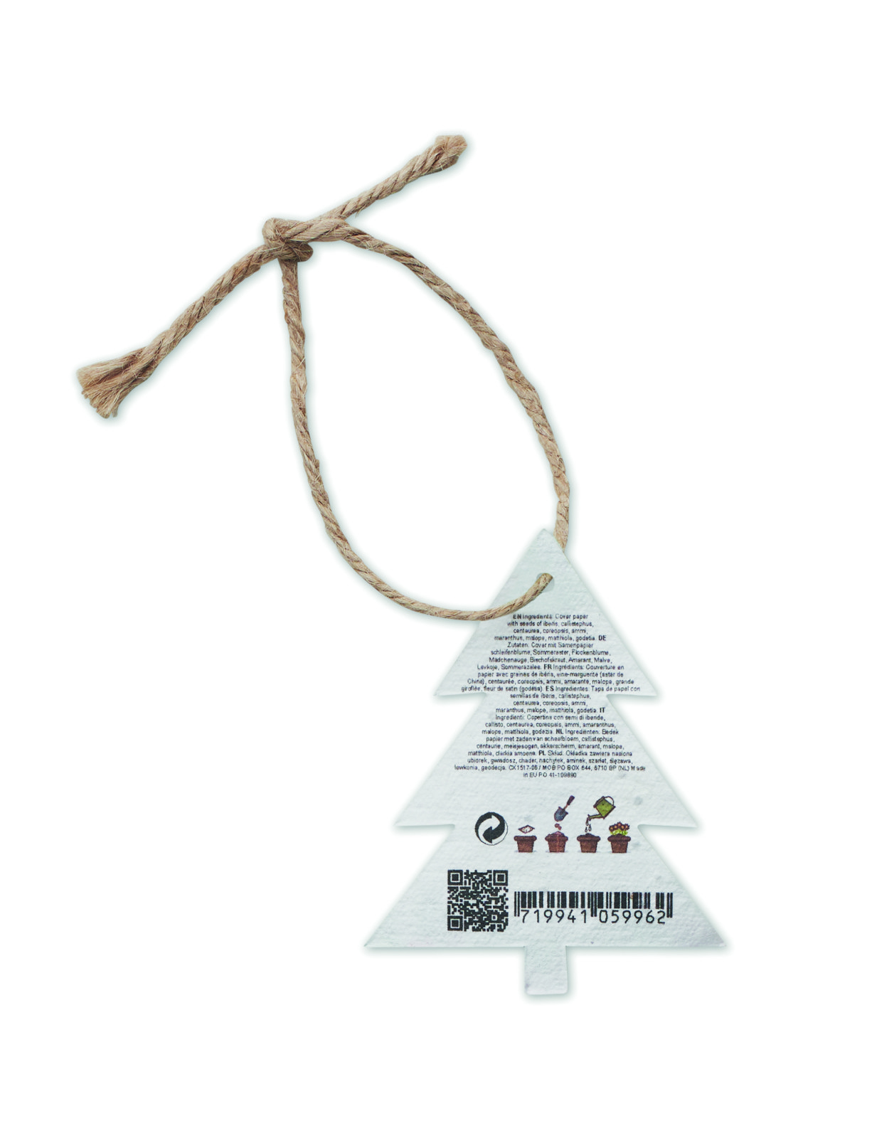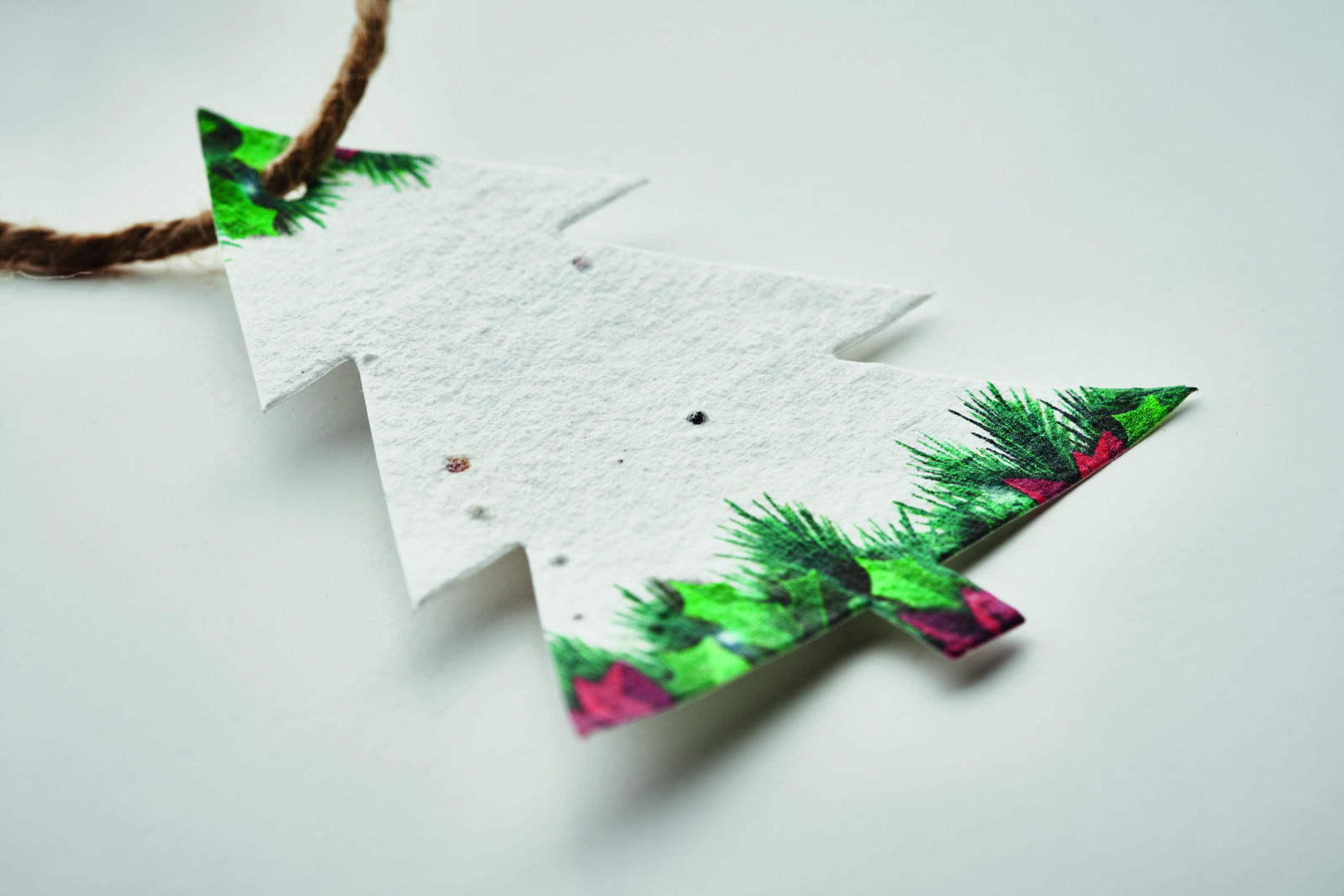 Razveselite svoje stranke, sodelavce ali ekološko ozaveščene partnerje s prazničnim pridihom, ki se vedno znova razdaja – Božični okraski iz semenskega papirja. Ta očarljiv okrasek, izdelan iz mehkega semenskega papirja, v katerega je vdelana živahna mešanica divjega cvetja, je oblikovan kot božično drevo in je opremljen z rustikalno vrvjo iz jute za enostavno obešanje.