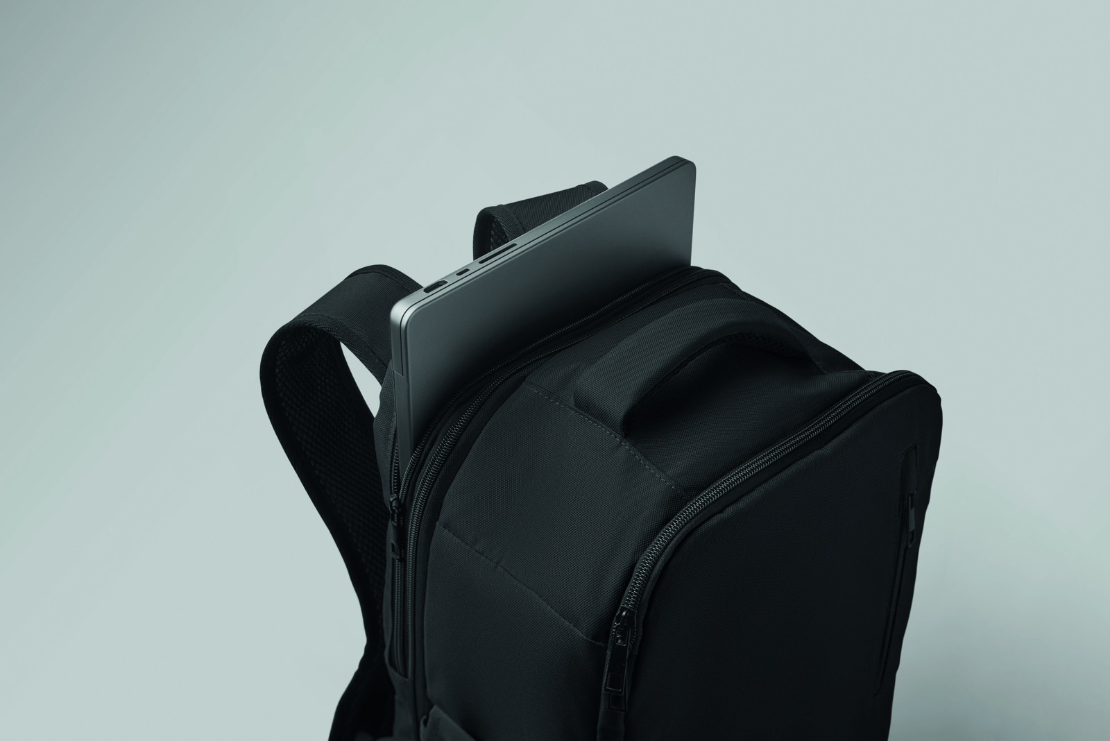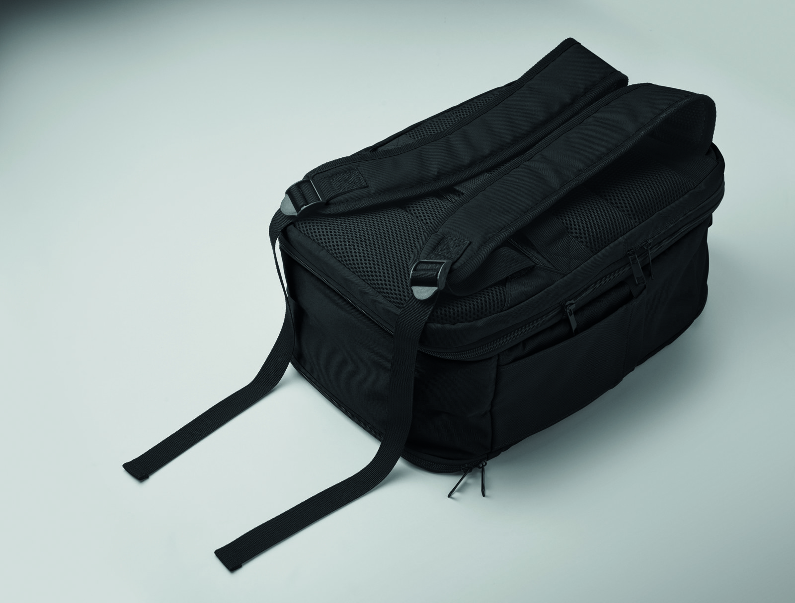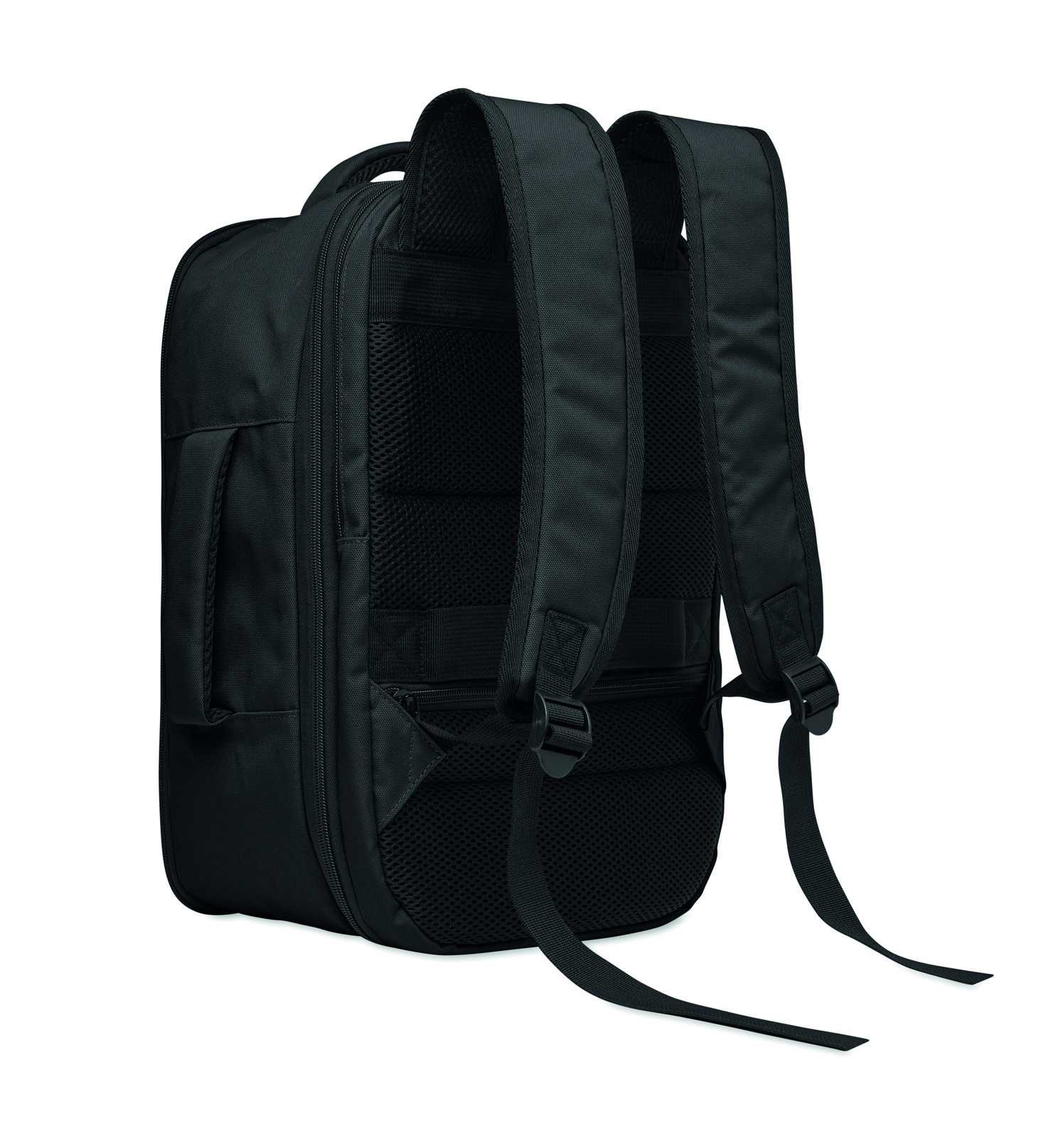 "Cabin-size carry-on extendable backpack made of 600D RPET polyester with 180o opening. Features a main compartment with two open sections, mesh division, padded 15"" laptop pocket, and luggage strap."