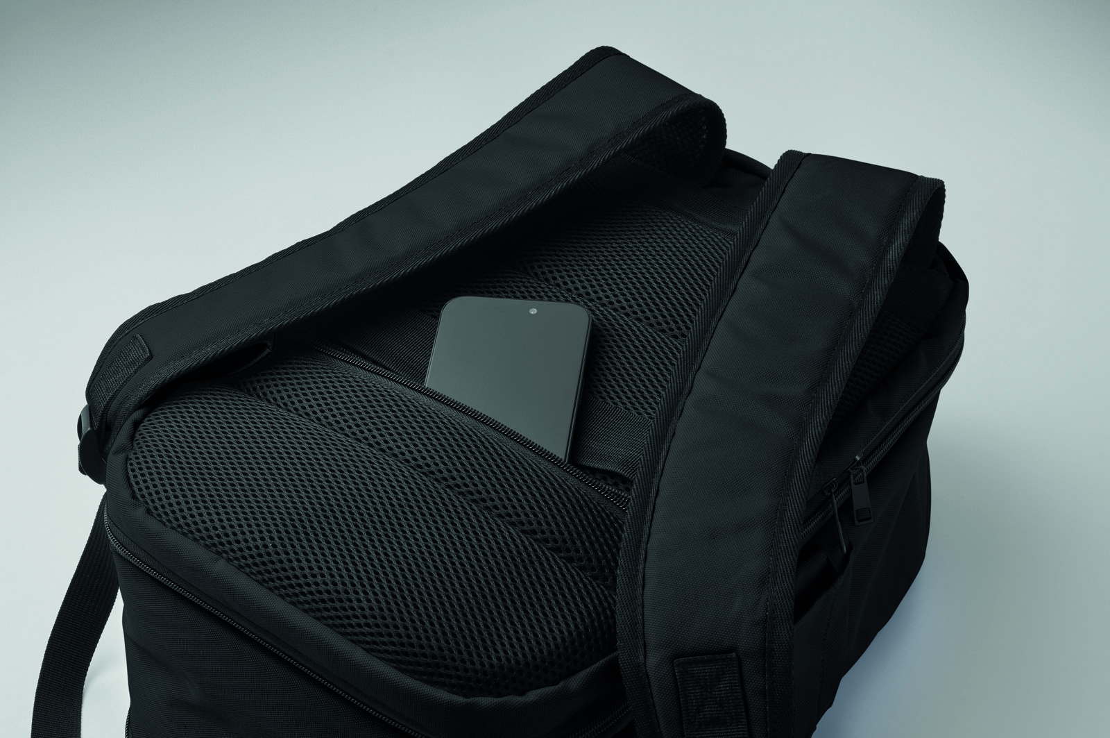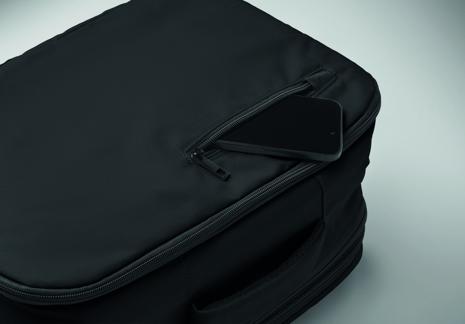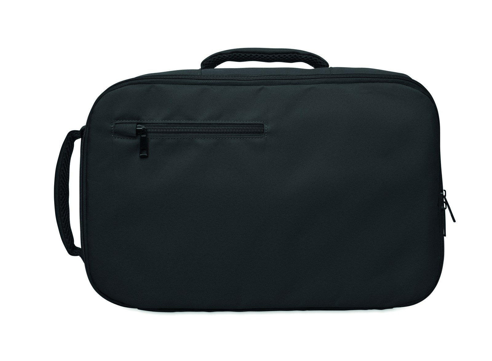 "Cabin-size carry-on extendable backpack made of 600D RPET polyester with 180o opening. Features a main compartment with two open sections, mesh division, padded 15"" laptop pocket, and luggage strap."