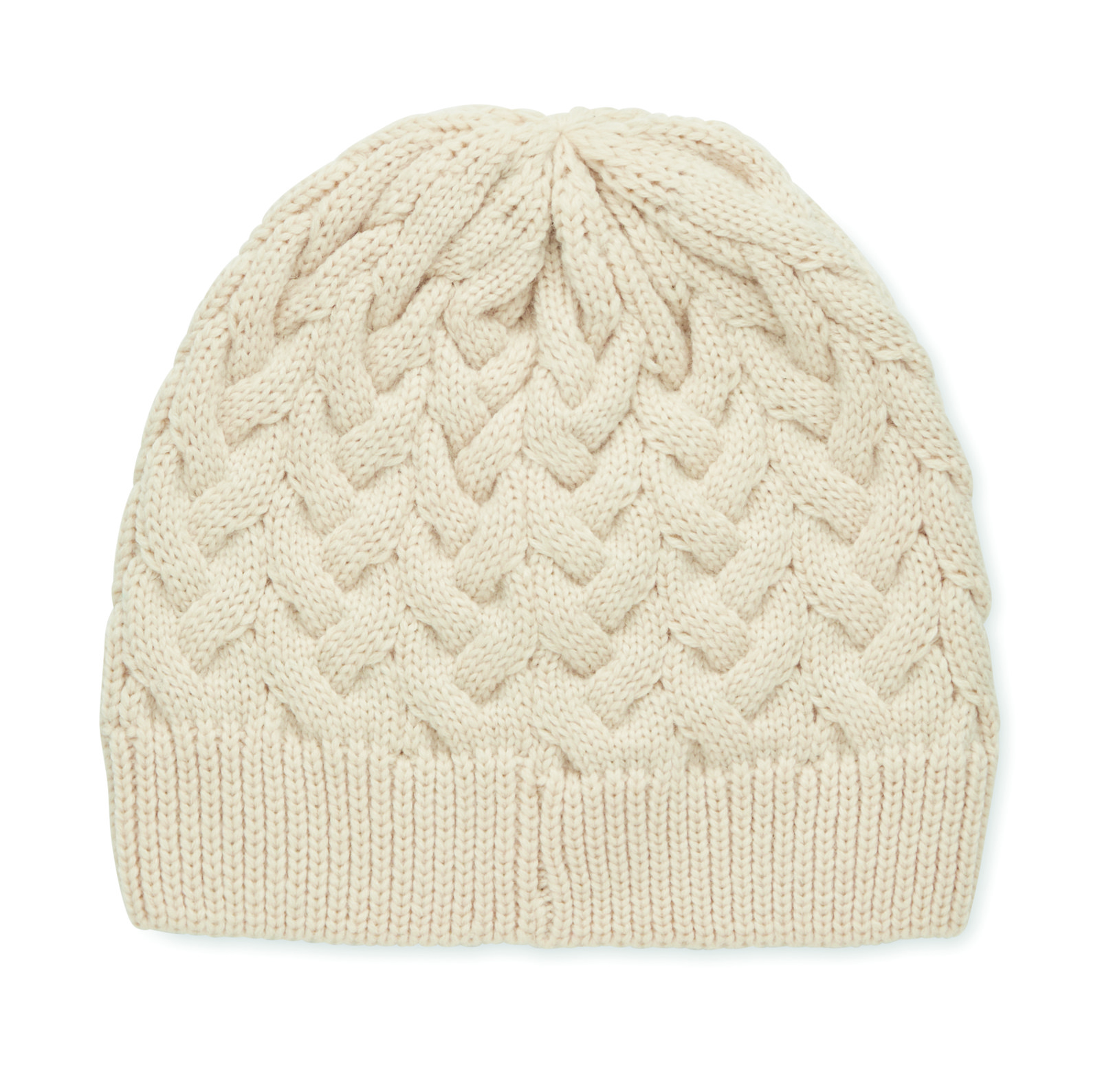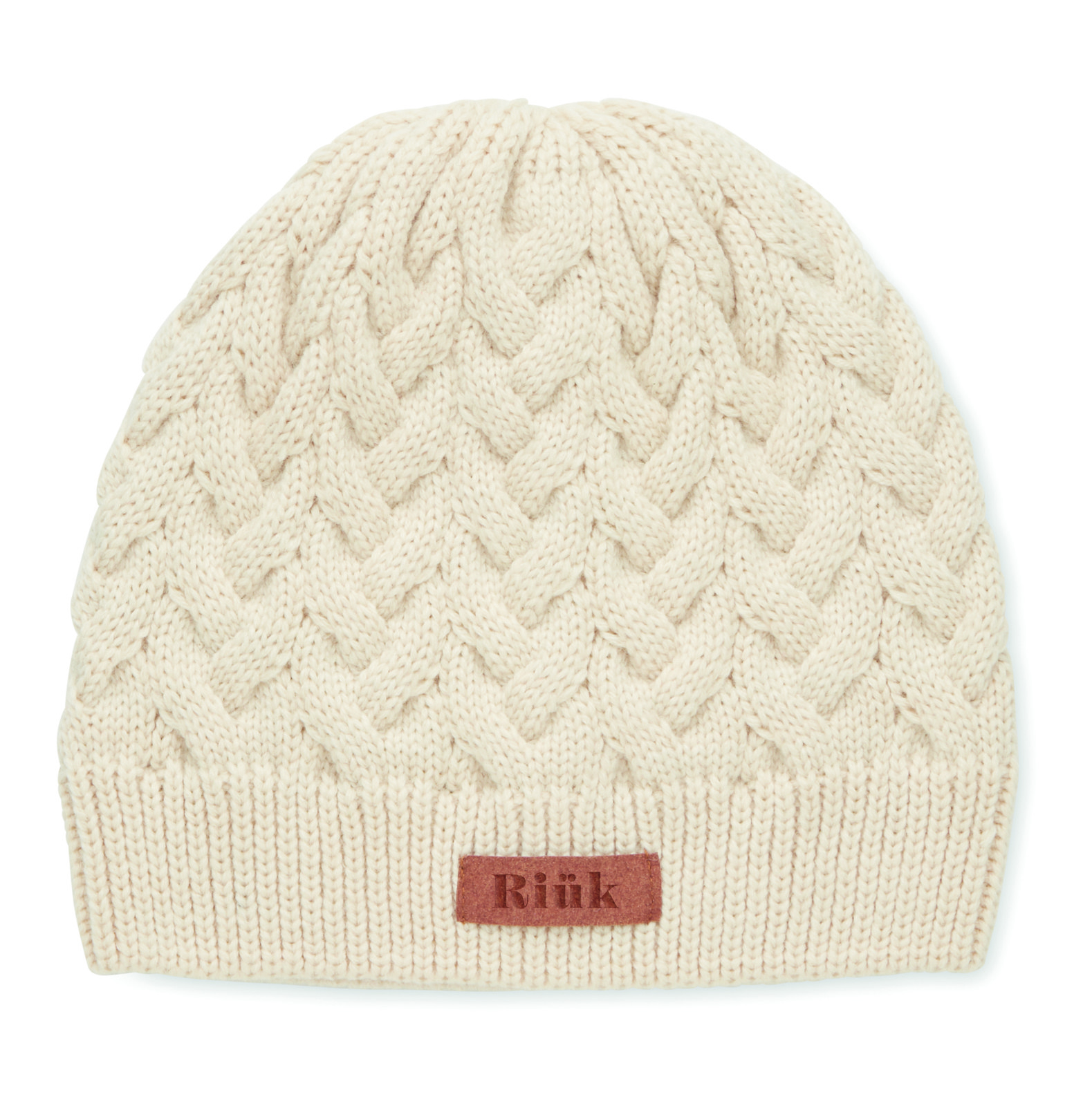 Cable knit beanie in RPET with label for printing area.