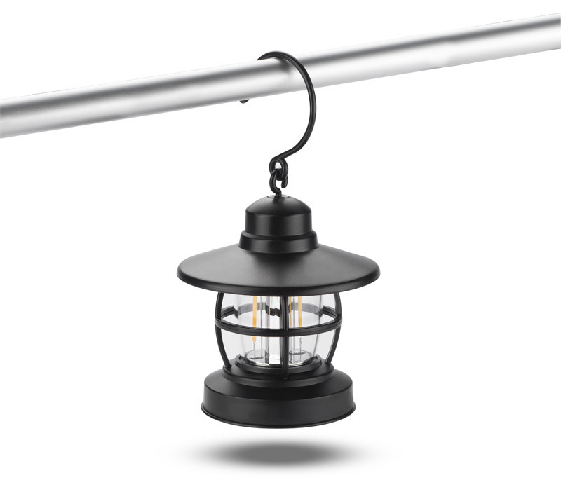 Portable CAMPE lamp with COB LEDs. Large hook allows for convenient hanging. Battery powered: 3 x AAA.