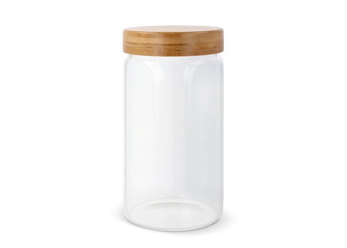 Introducing our elegant 1200ml glass canister with a stylish bamboo lid. Store your essentials in class. Perfect for kitchen and home organization.