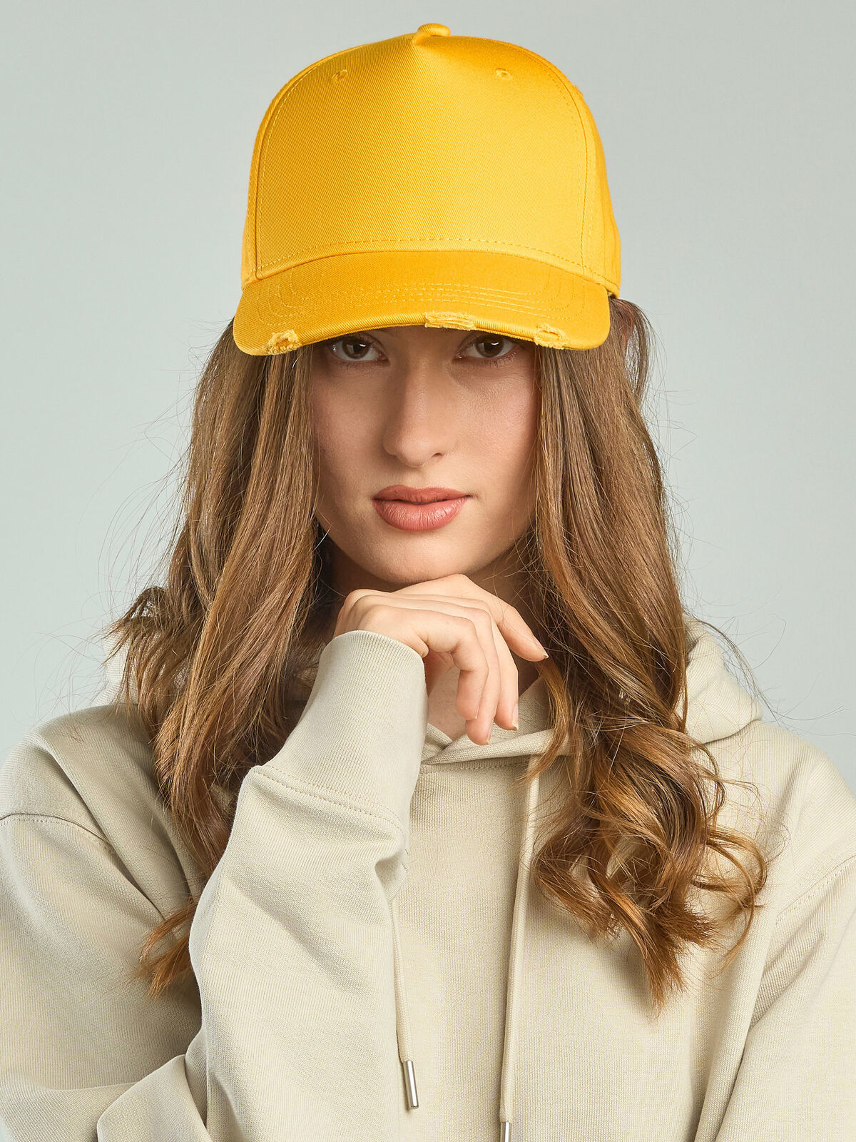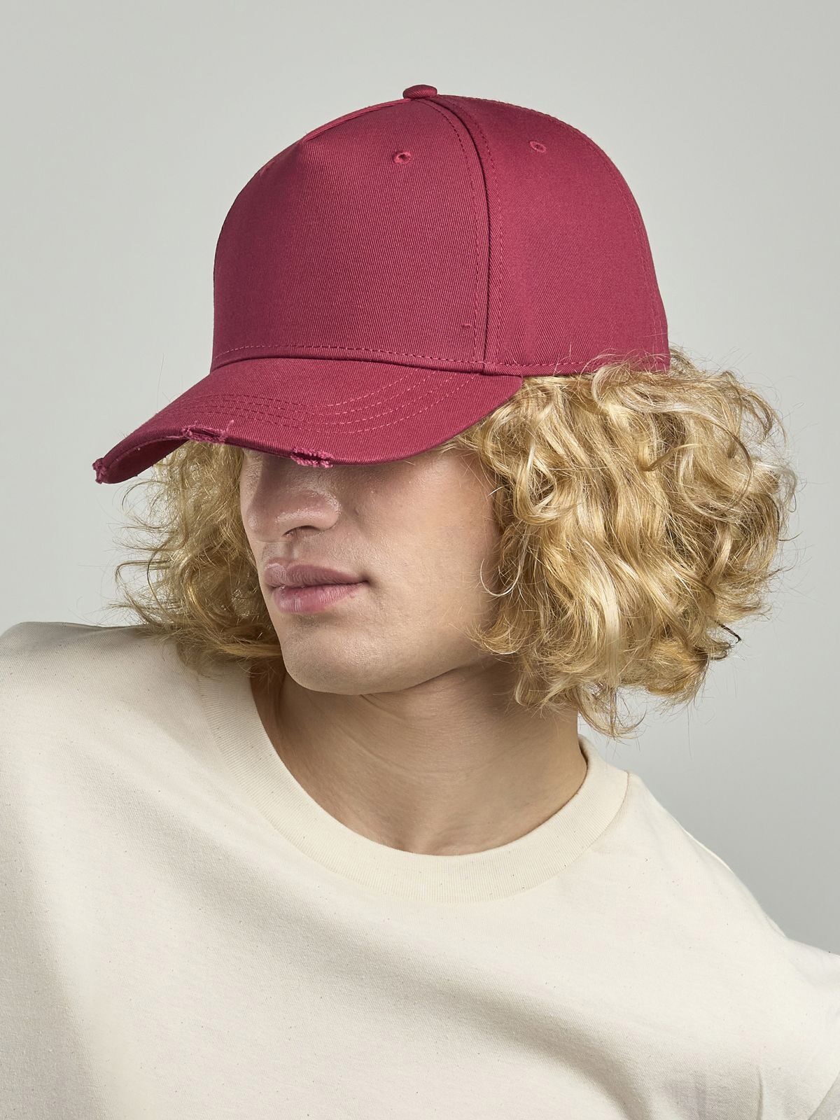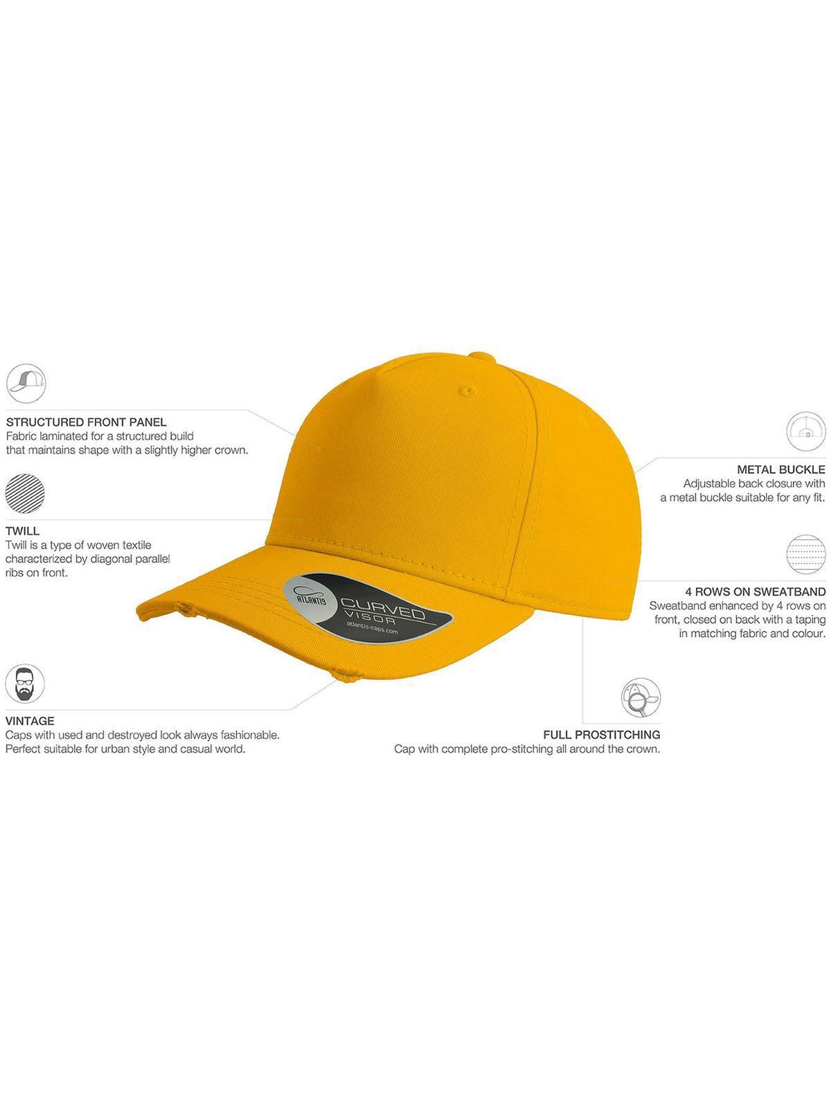 100% cotton. 5 panels cap, stitched eyelets, destroyed visor, structured front panel, precurved visor, closure with metal buckle, suitable for printing, garment washed, cotton sweatband, one size fits all. Removable label.