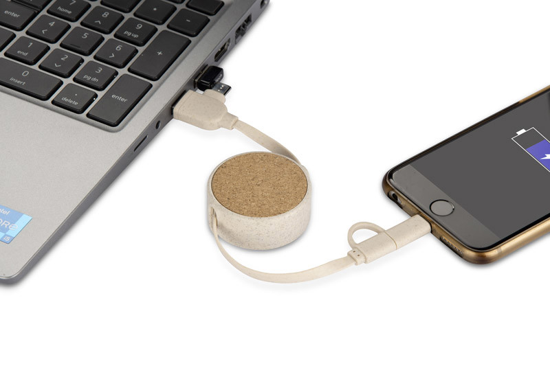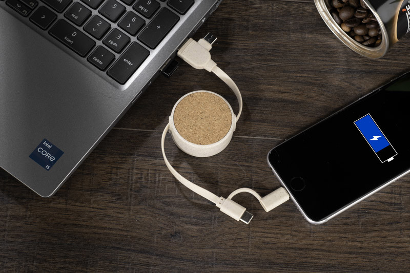 The SLOPI charging cable combines natural materials with functionality. Made from cork and wheat straw plastic, it features USB, 2 x USB C, and Lightning connectors, ensuring versatility and convenience. Its coiled design makes it easy to store, while the natural look gives it a unique character. Perfect as a practical promotional gadget.