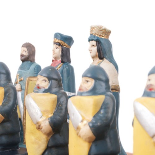 Handcrafted chess set; each piece is sculpted and painted by hand.Inside, there are compartments for storing the pieces individually (approximate piece dimensions: 3.8 x 9.5 cm). Each piece comes in a small white box (7.9 x 4 cm).nted in a small white box (size 7.9x4 cm)
