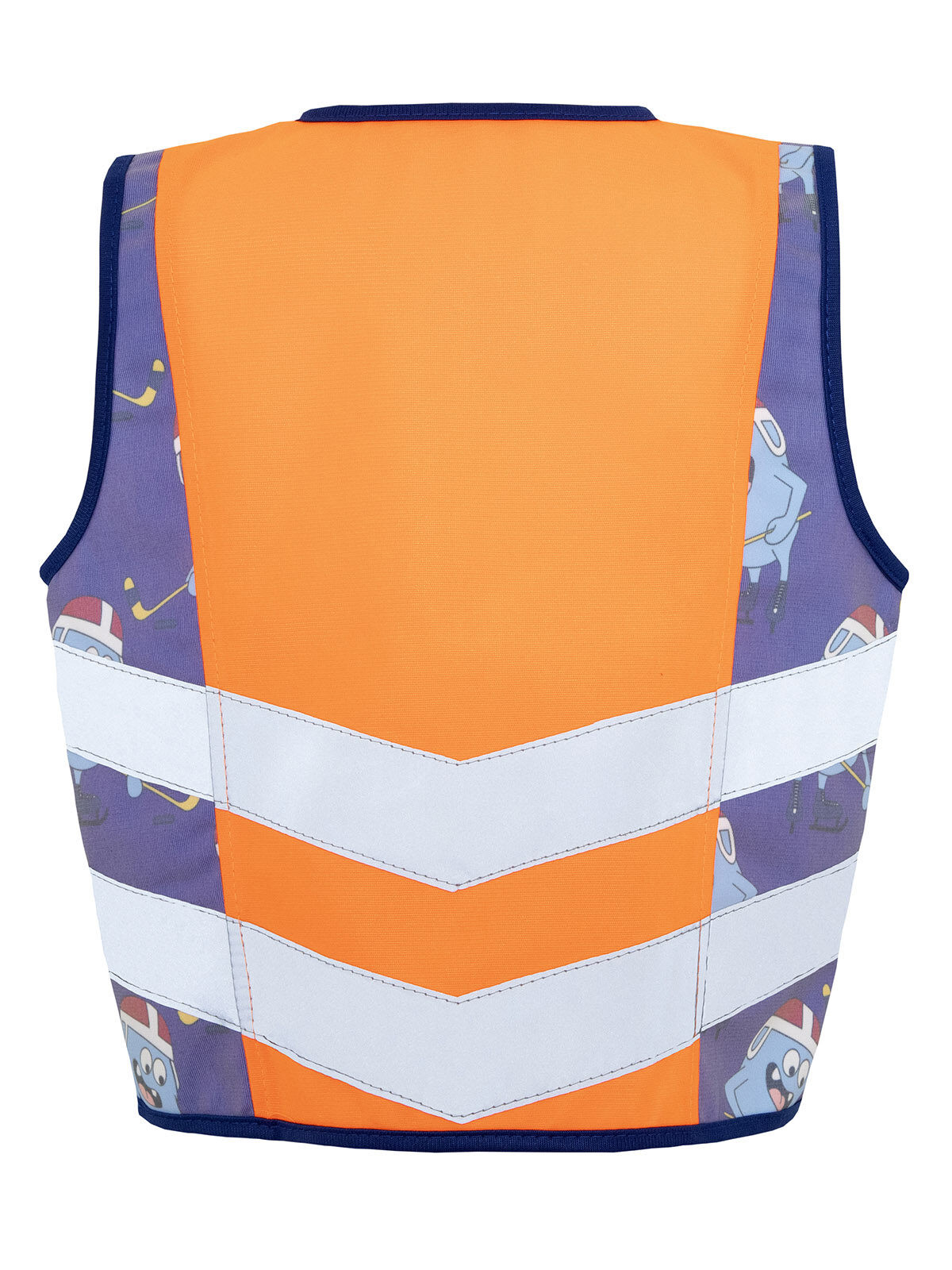 100% polyester. Children's safety vest with sporty designs, high visibility due to lightweight patterned fabric with reflective coating and reflective stripes, convenient zipper closure. certified according to EN 17353