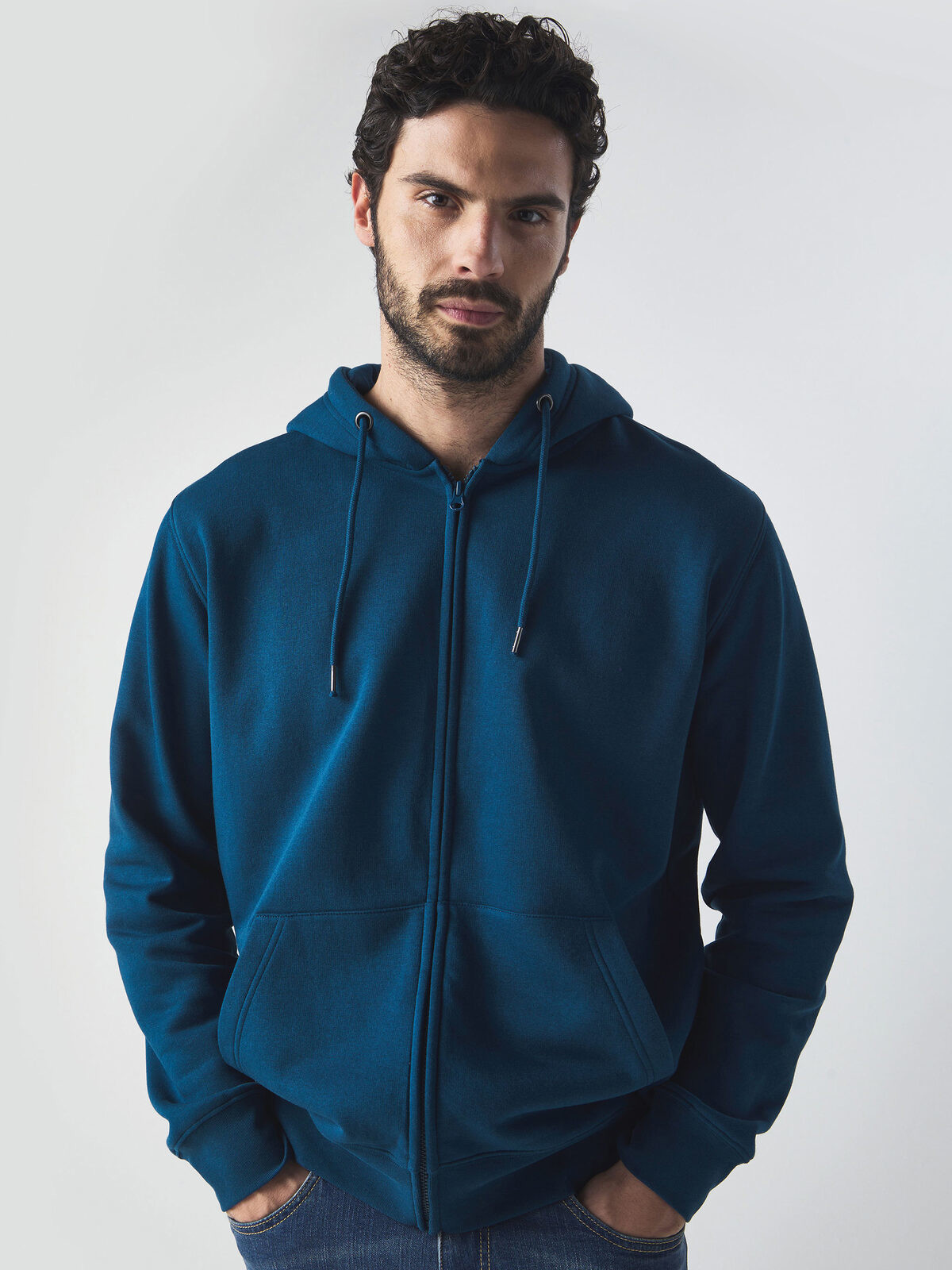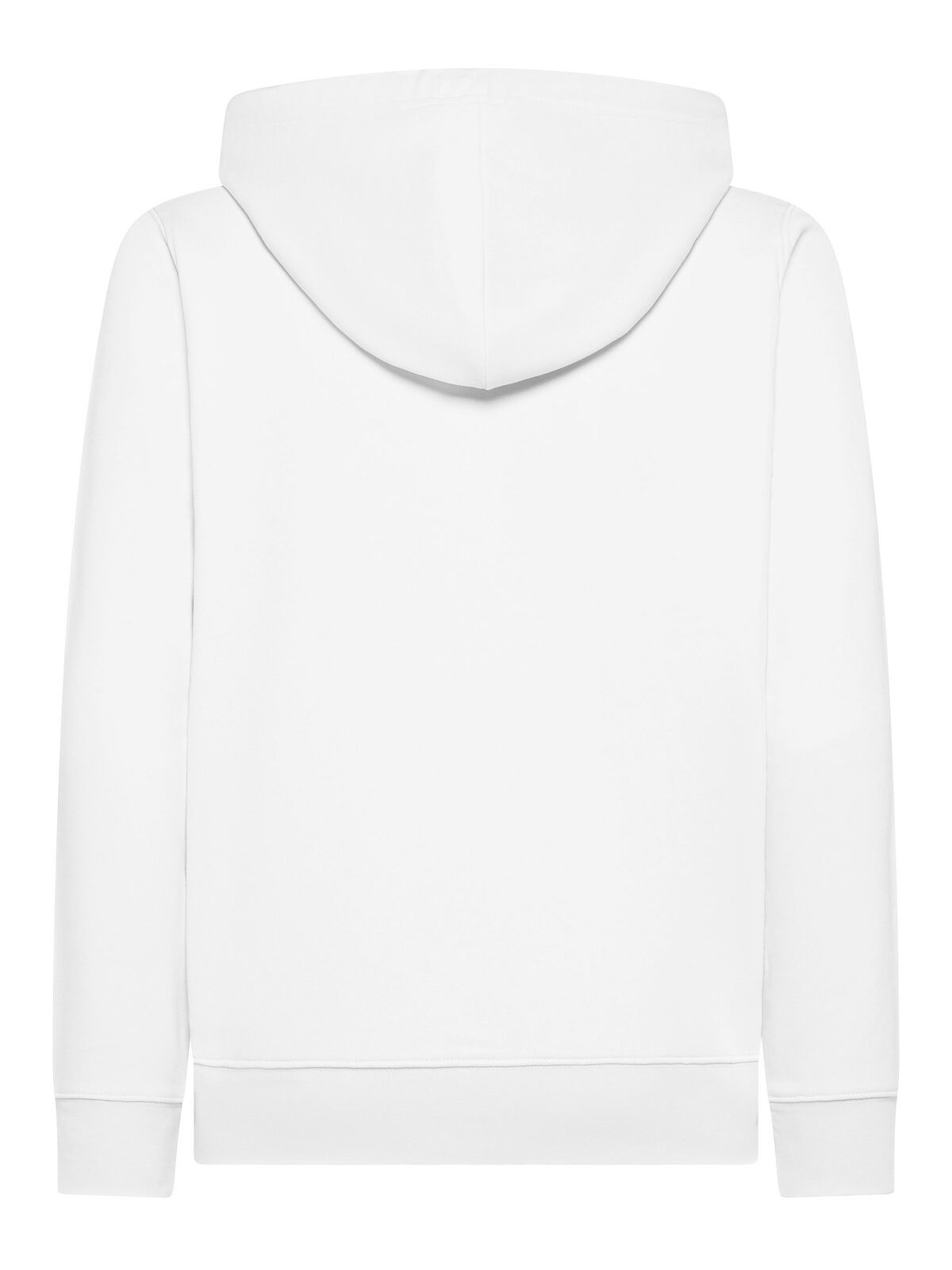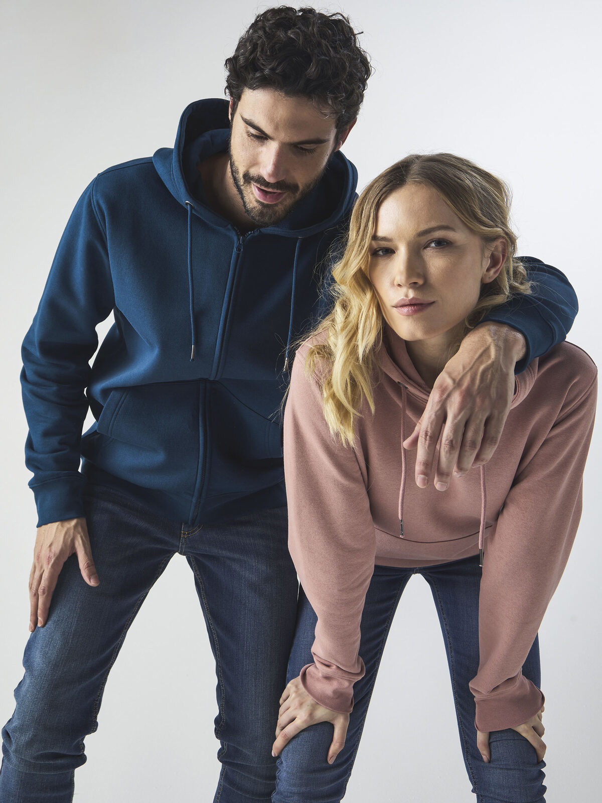 80% organic cotton, 20% recycled polyester. Genderless double-layer hoodie in eco-sustainable enzyme-treated fabric, with tone-on-tone zipper, eyelets, and metal drawstrings. Set-in sleeves, kangaroo pocket, side seams, ribbed cuffs, and ribbed waistband. Brushed interior and 3-thread construction with 100% cotton exterior for quality printing, stability, and wash resistance. Size label on the neck and tear-off side label with logo, composition, and instructions.