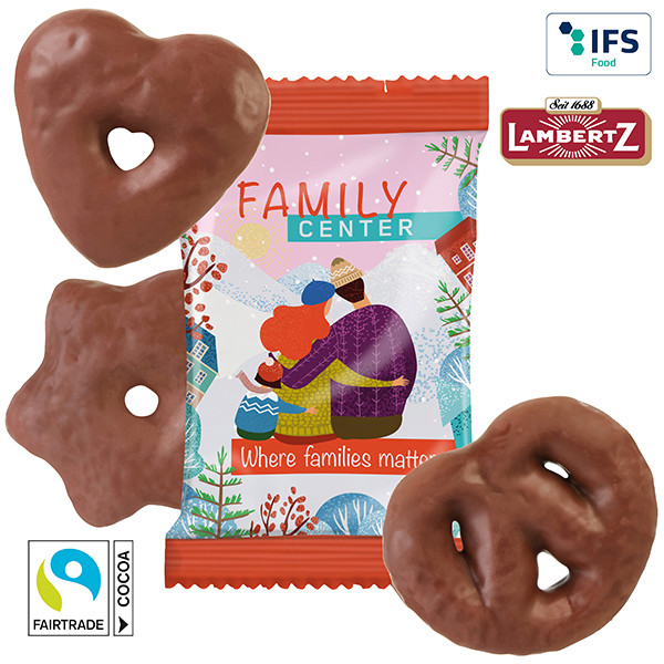 Gingerbread heart, star and pretzel, covered with 30 % milk chocolate, shapes mixed, individually packed in a shiny or matt coated white flowpack.