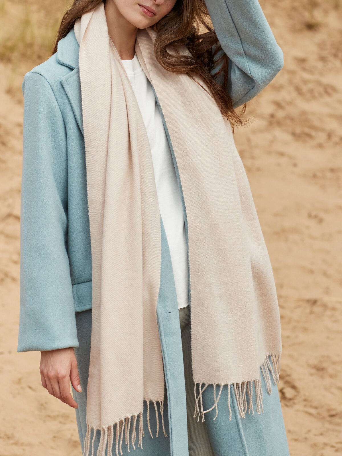 100% acrylic. Wowen scarf. TearAway adhesive fabric label, oversized style, luxury Soft-Touch yarn, unisex styling, tassel trim.