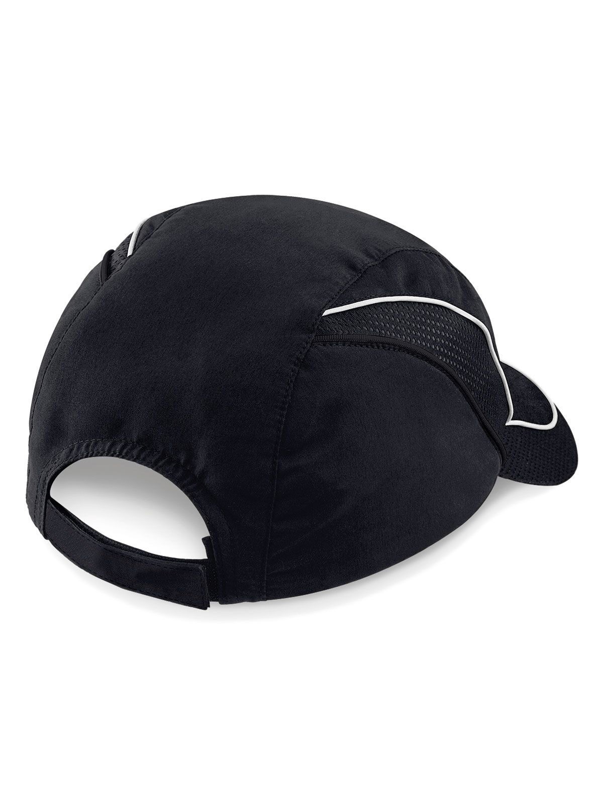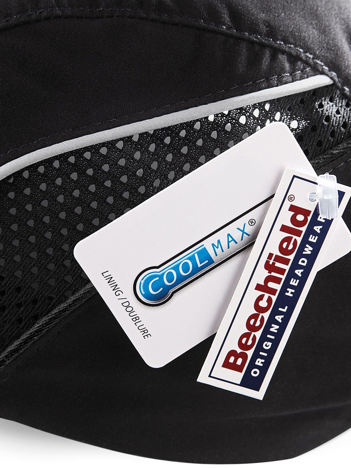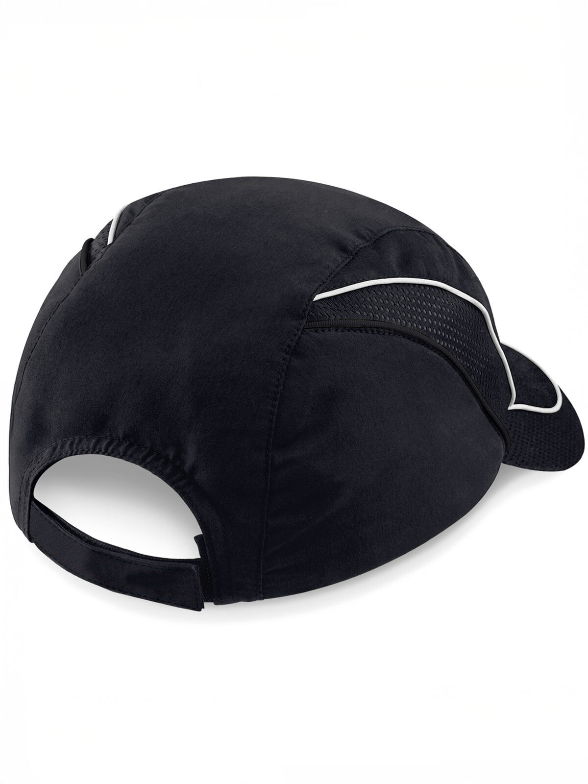 100% Polyester - Microfibre. Cap with pre-curved peak, seamless, centralised front panel, 100% polyester sweatband, mesh ventilation panels, enhanced visibility reflective accents, Rip-Strip™ size adjuster, one size fits all. Removable label.