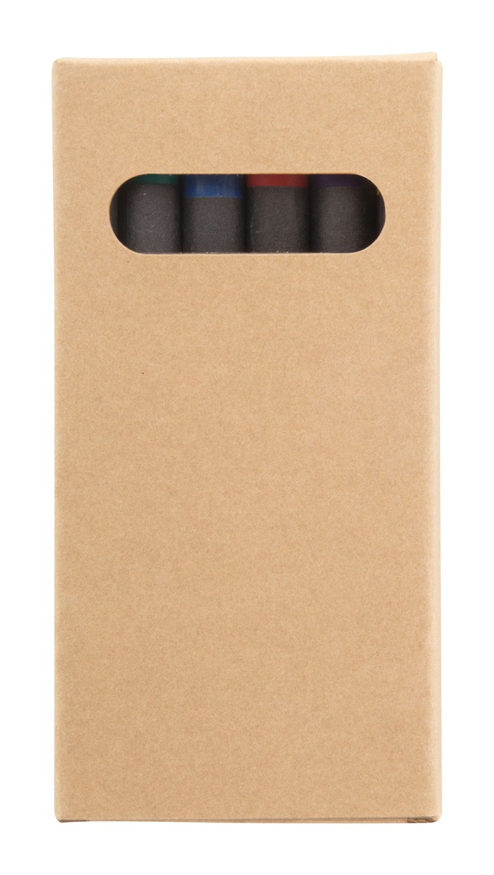 Black paper covered, coloured crayons (6 pcs) in full colour printed kraft paper box. Price includes digital printing. MOQ: 100 pcs.