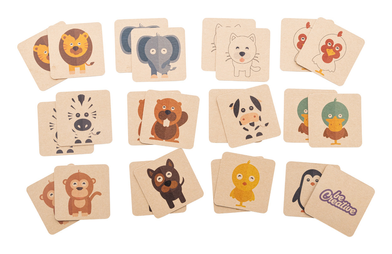 Kraft paper memory game with thematic motives in custom kraft paper box. With 24 tiles (55x55 mm). Price includes full colour print on backside of all tiles and a full colour printed box. MOQ: 100 pcs.