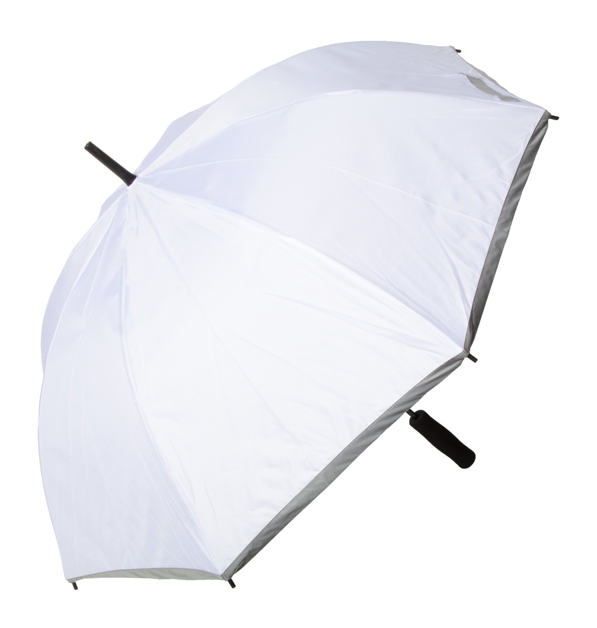 Custom made, 8 panel automatic umbrella with reflective trimming, metal shaft, fibreglass ribs and EVA handle. 190T RPET pongee. With distinctive RPET label and sublimation printed graphics on all panels. MOQ: 50 pcs. For promotional use only, the product does not qualify as a Personal Protective Equipment.