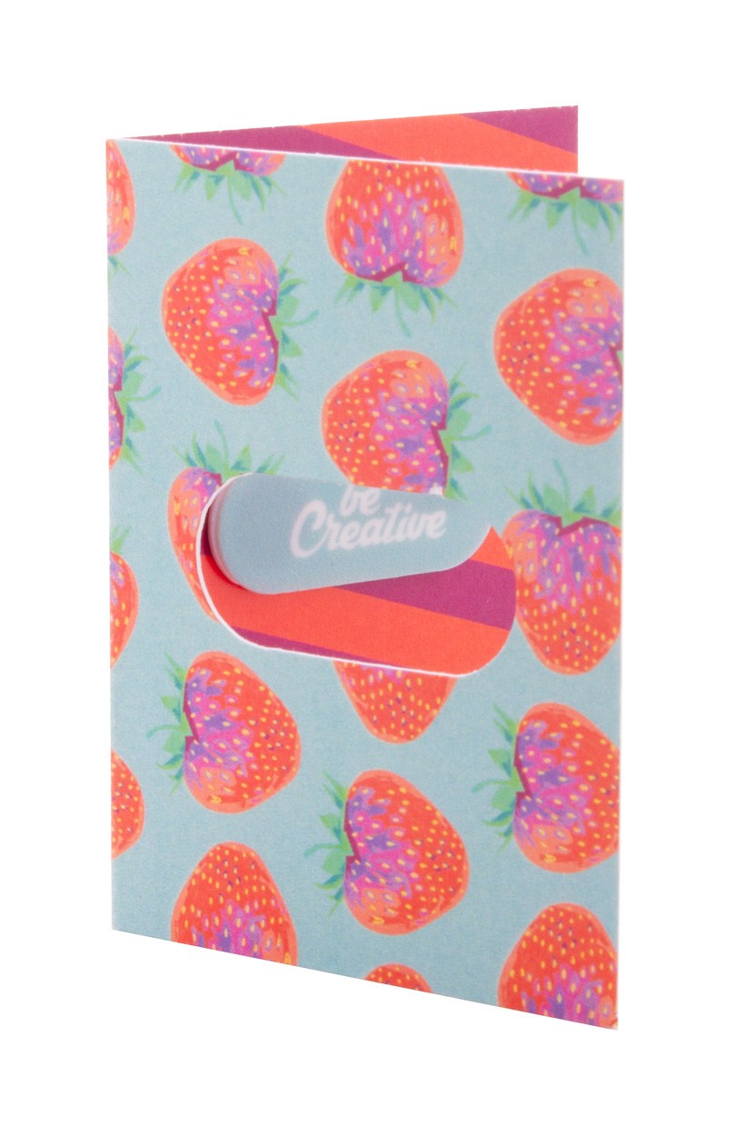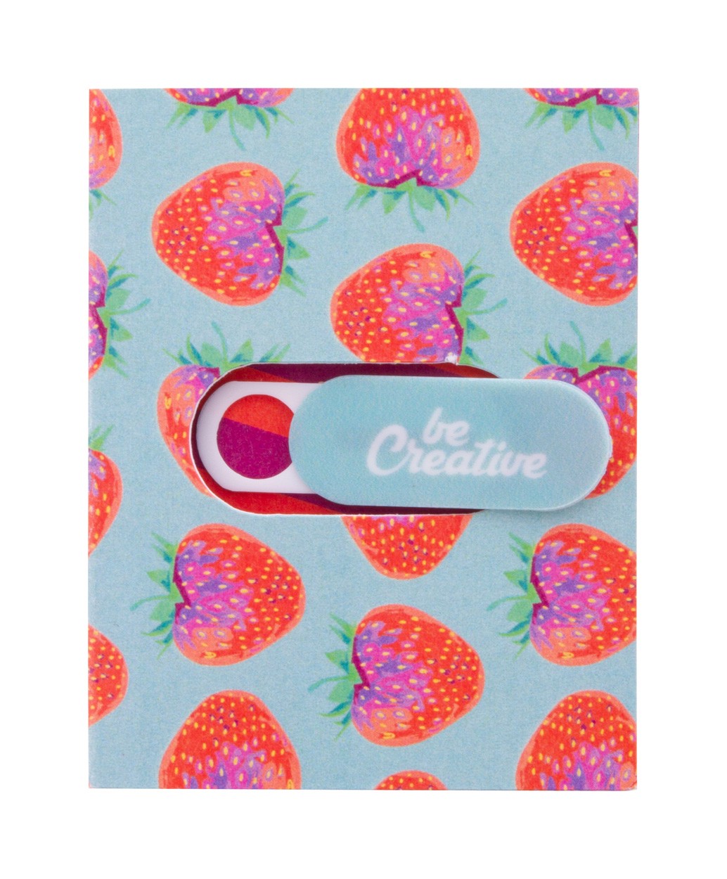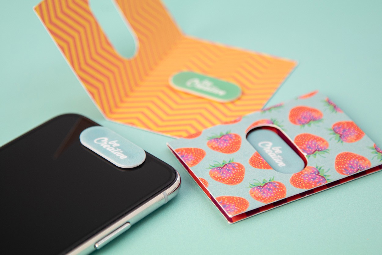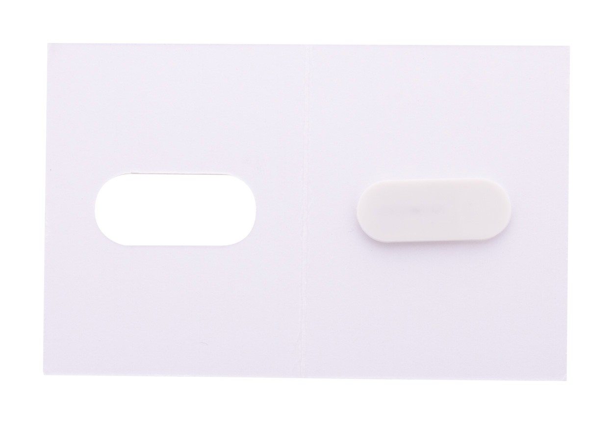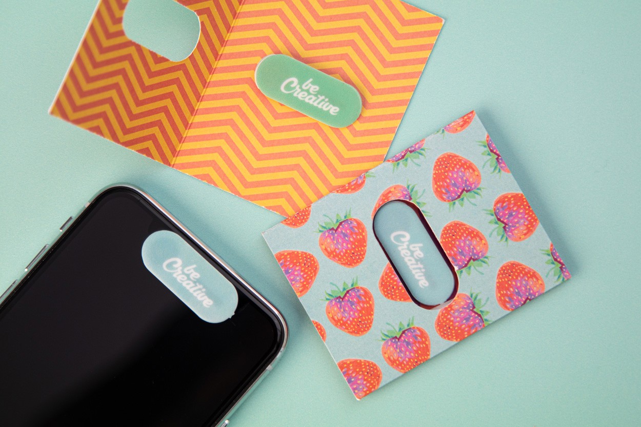 Custom, full colour printed plastic, anti spy webcam blocker with sliding cover and adhesive back. With all over digital printed paper booklet. Price includes digital and UV LED printing. MOQ: 100 pcs.
